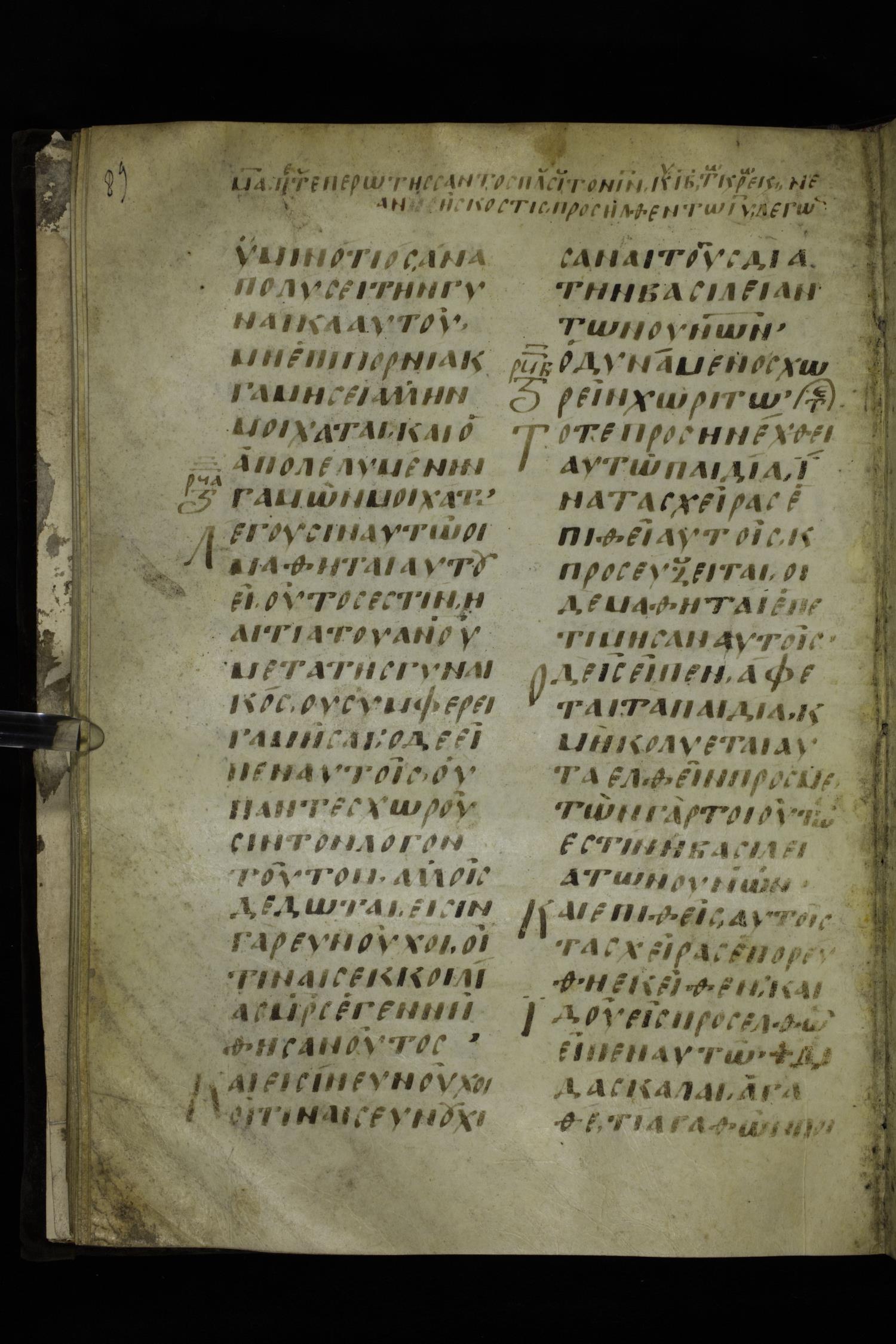 Ninth century majuscule of the Gospels on parchment; 254 leaves, 2 columns, 24-31 lines per column.