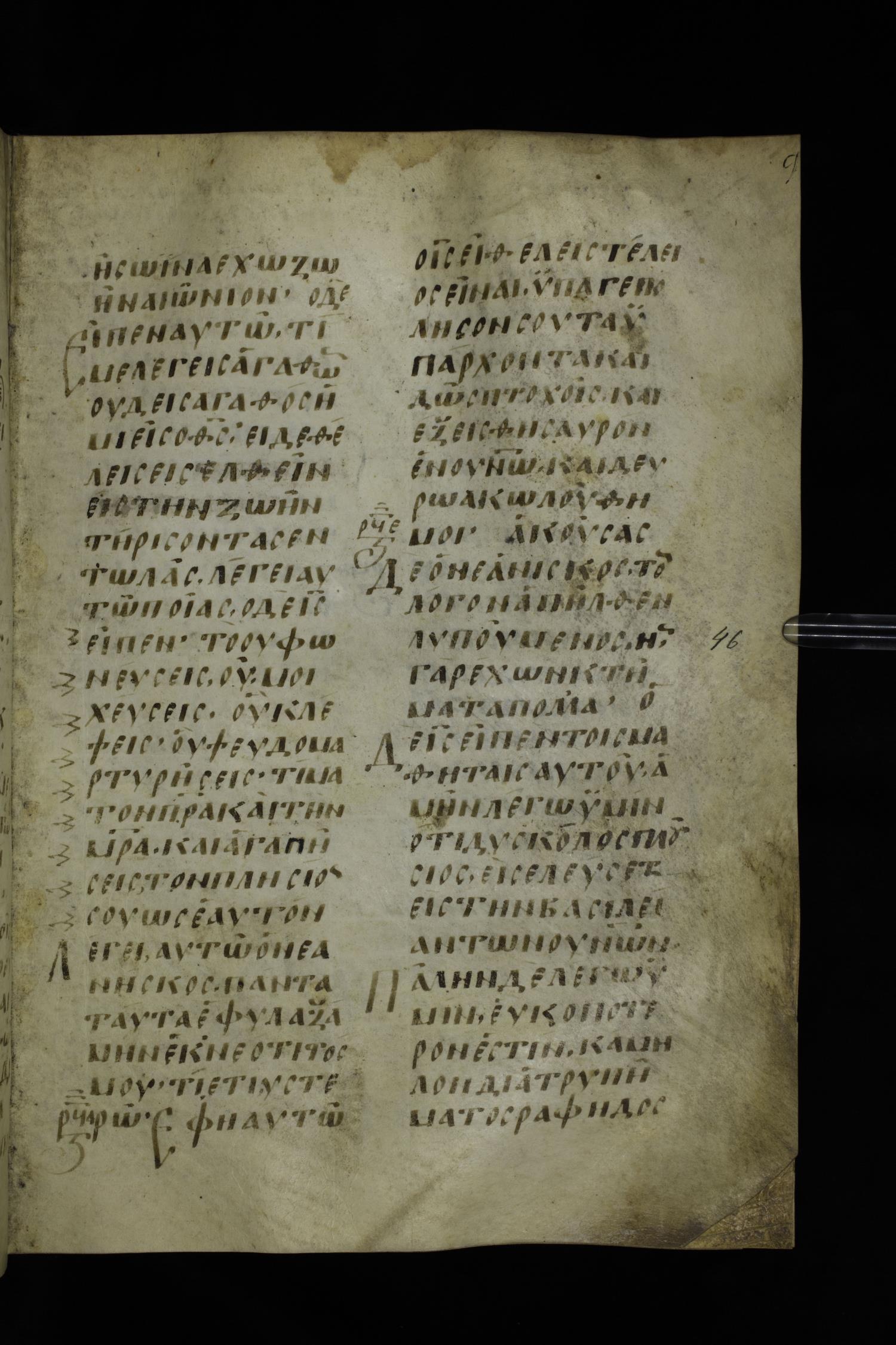Ninth century majuscule of the Gospels on parchment; 254 leaves, 2 columns, 24-31 lines per column.