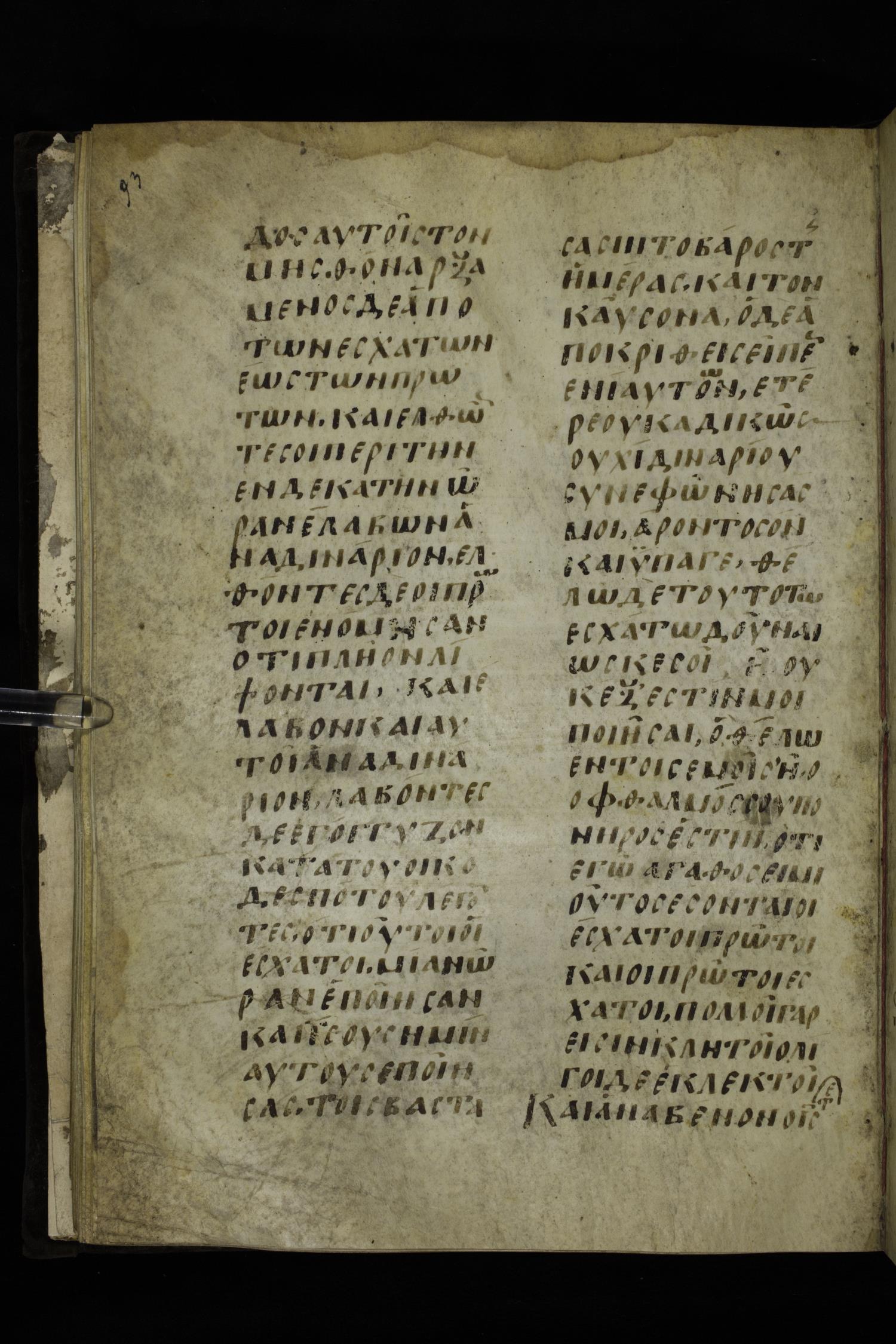Ninth century majuscule of the Gospels on parchment; 254 leaves, 2 columns, 24-31 lines per column.