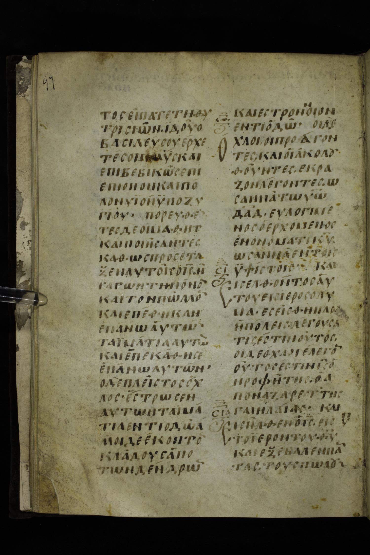 Ninth century majuscule of the Gospels on parchment; 254 leaves, 2 columns, 24-31 lines per column.