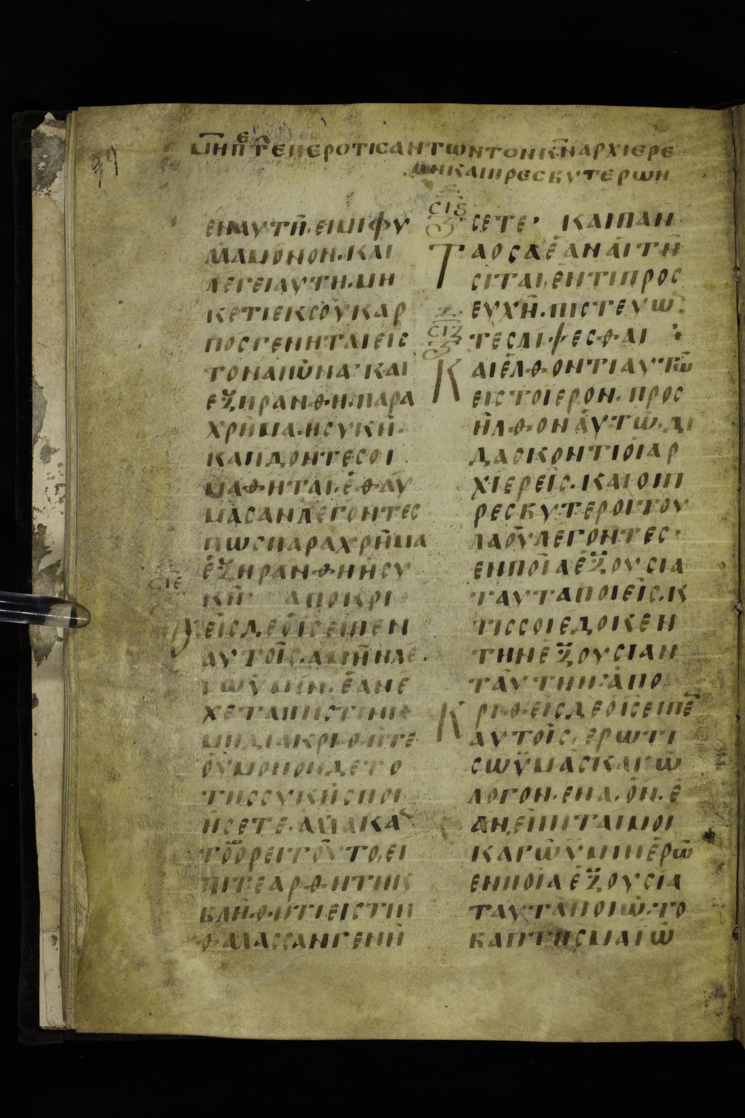 Ninth century majuscule of the Gospels on parchment; 254 leaves, 2 columns, 24-31 lines per column.