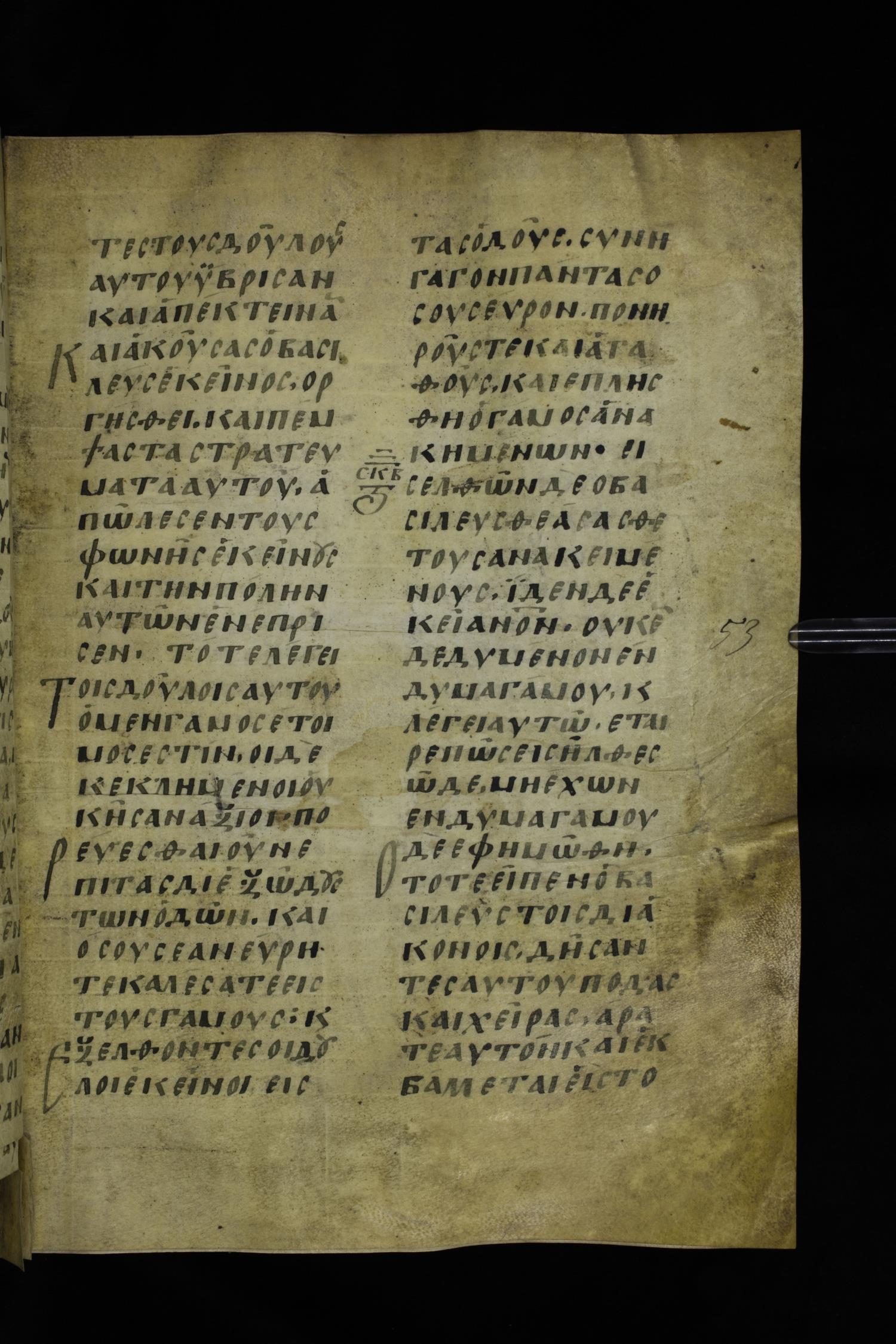 Ninth century majuscule of the Gospels on parchment; 254 leaves, 2 columns, 24-31 lines per column.