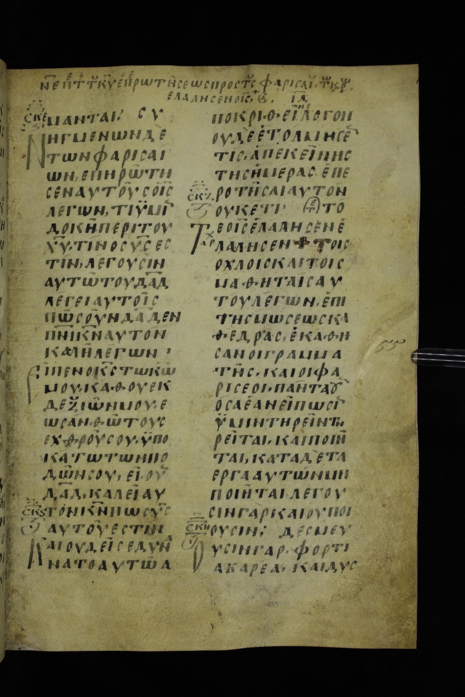 Ninth century majuscule of the Gospels on parchment; 254 leaves, 2 columns, 24-31 lines per column.