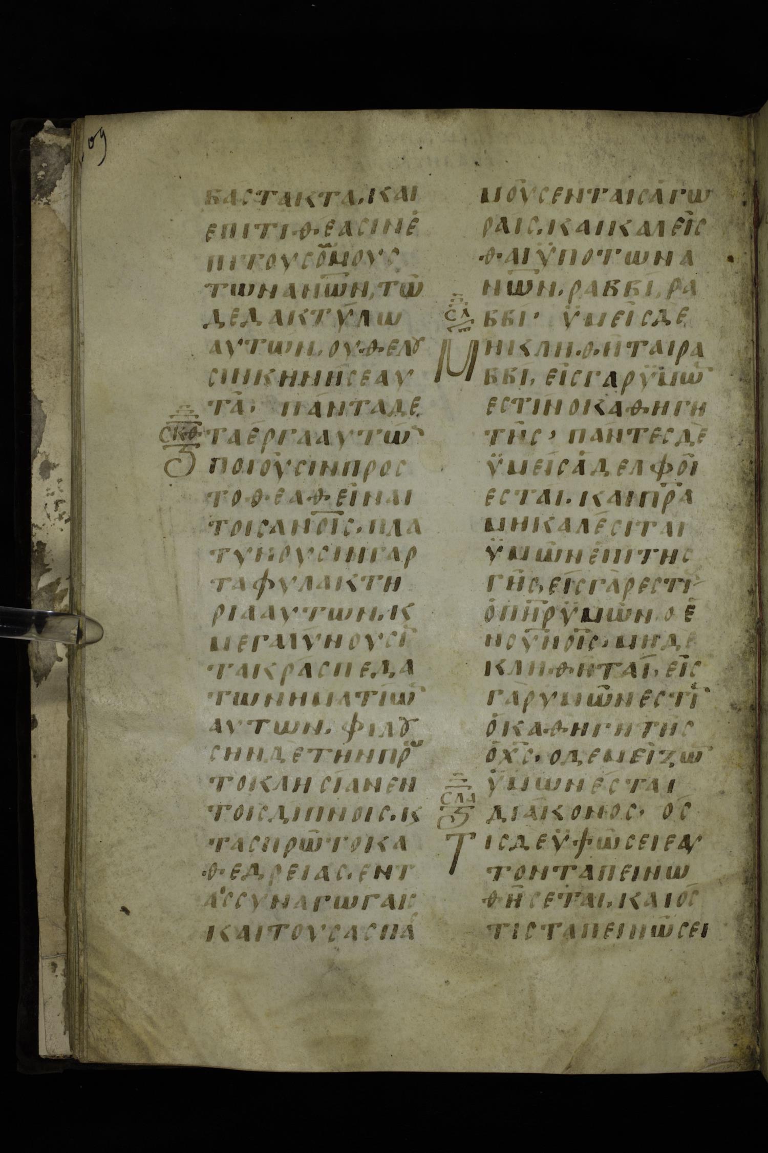 Ninth century majuscule of the Gospels on parchment; 254 leaves, 2 columns, 24-31 lines per column.