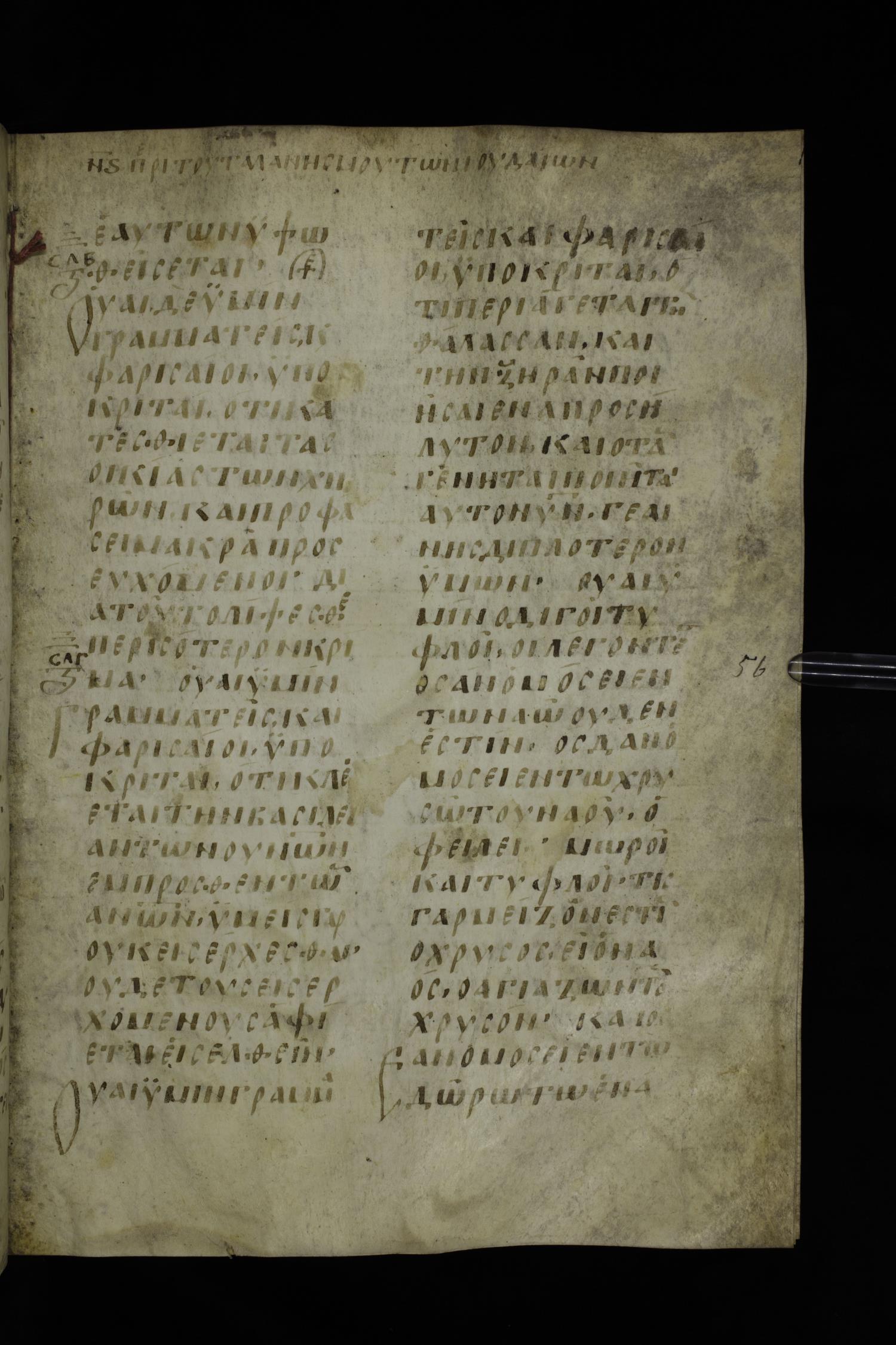 Ninth century majuscule of the Gospels on parchment; 254 leaves, 2 columns, 24-31 lines per column.