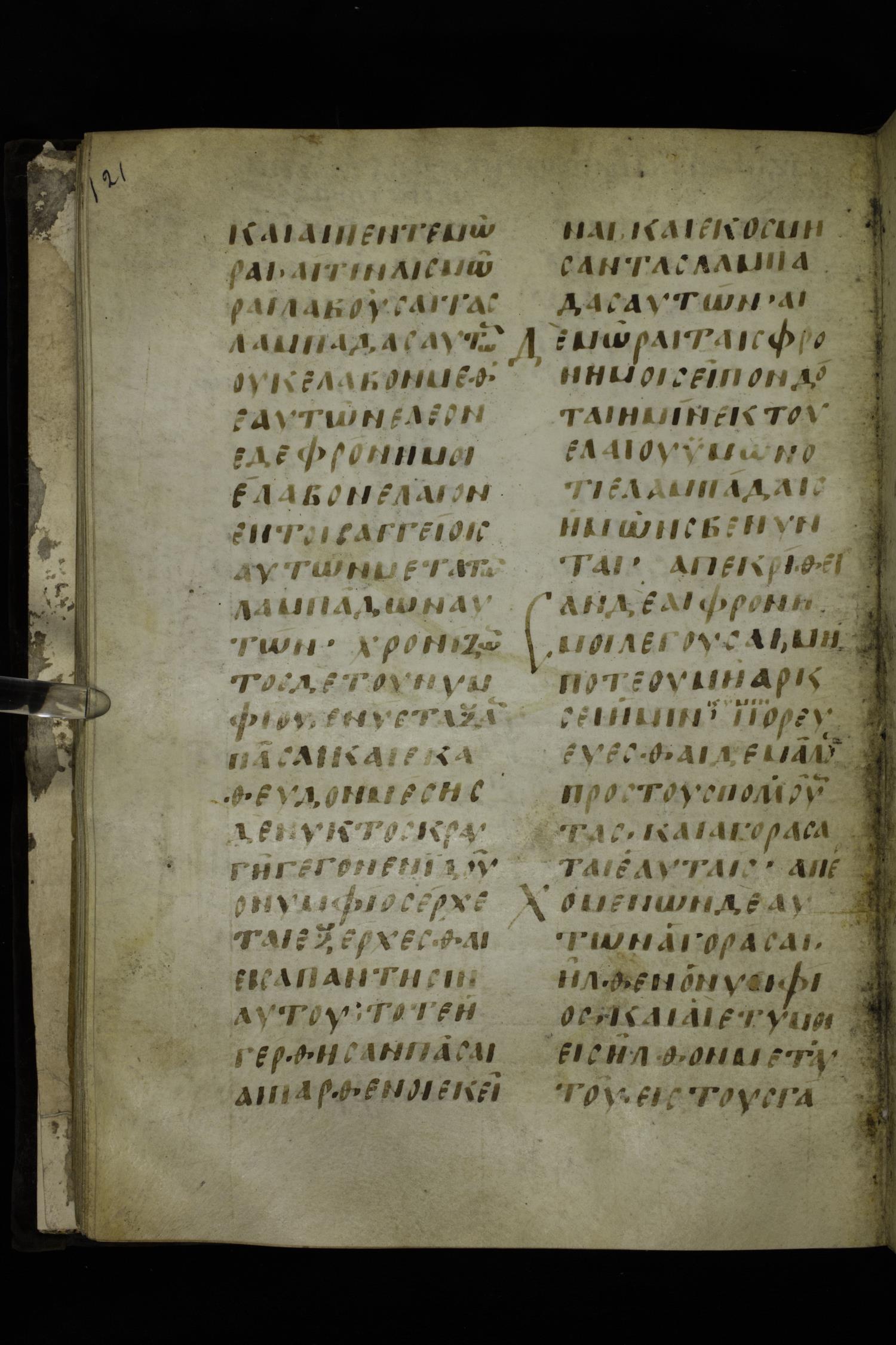 Ninth century majuscule of the Gospels on parchment; 254 leaves, 2 columns, 24-31 lines per column.