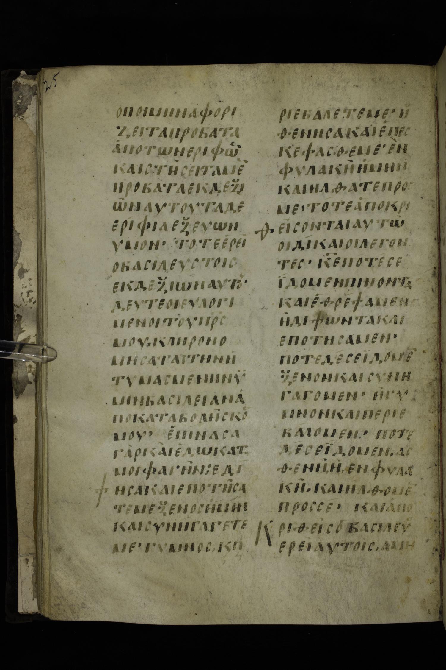 Ninth century majuscule of the Gospels on parchment; 254 leaves, 2 columns, 24-31 lines per column.
