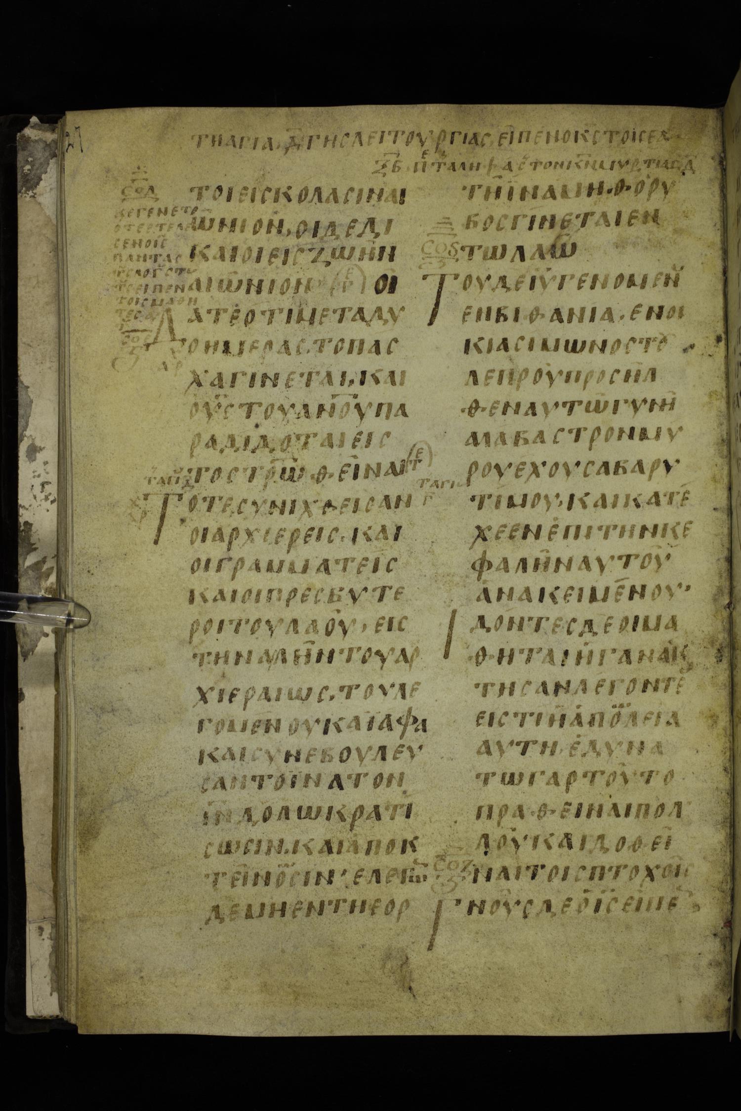 Ninth century majuscule of the Gospels on parchment; 254 leaves, 2 columns, 24-31 lines per column.