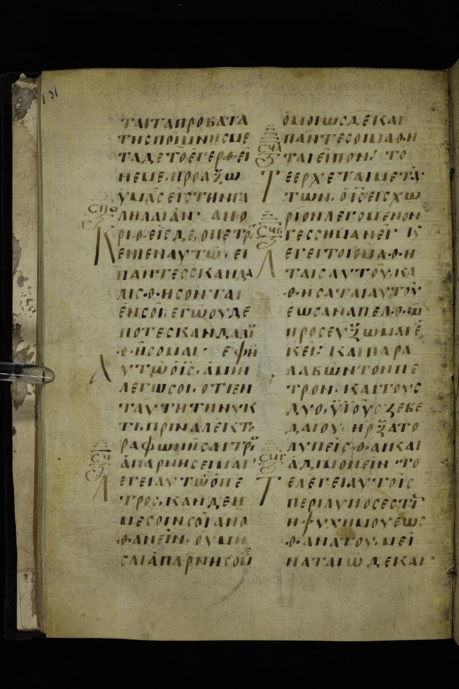 Ninth century majuscule of the Gospels on parchment; 254 leaves, 2 columns, 24-31 lines per column.