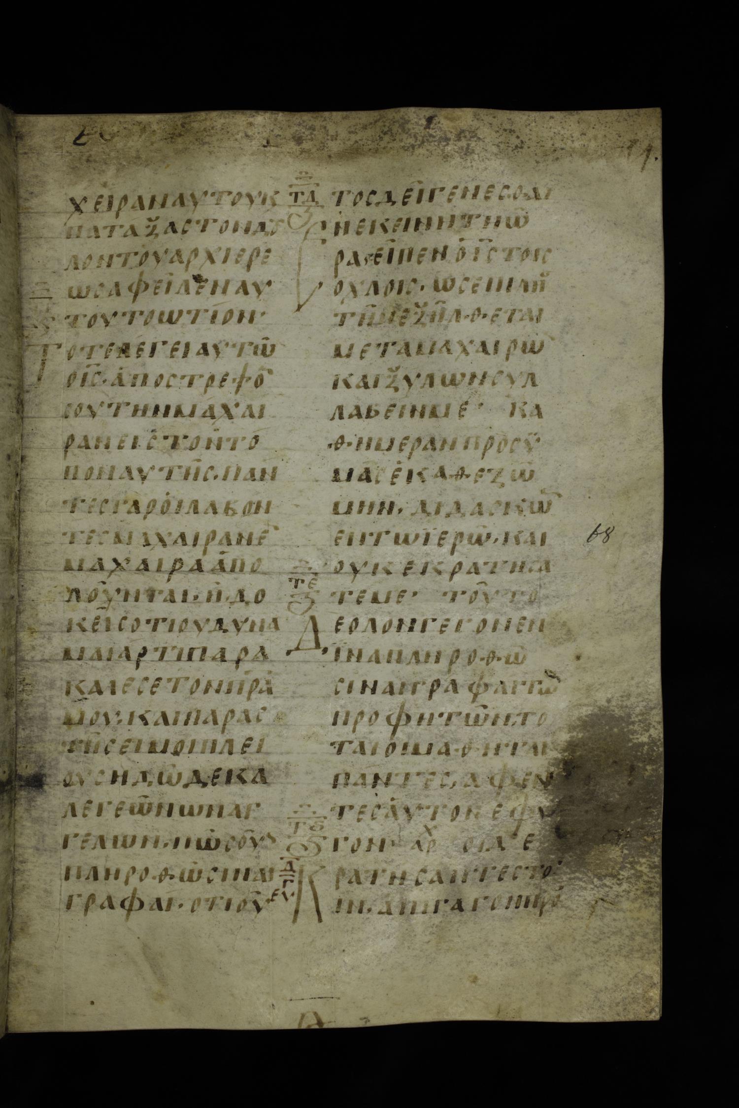 Ninth century majuscule of the Gospels on parchment; 254 leaves, 2 columns, 24-31 lines per column.