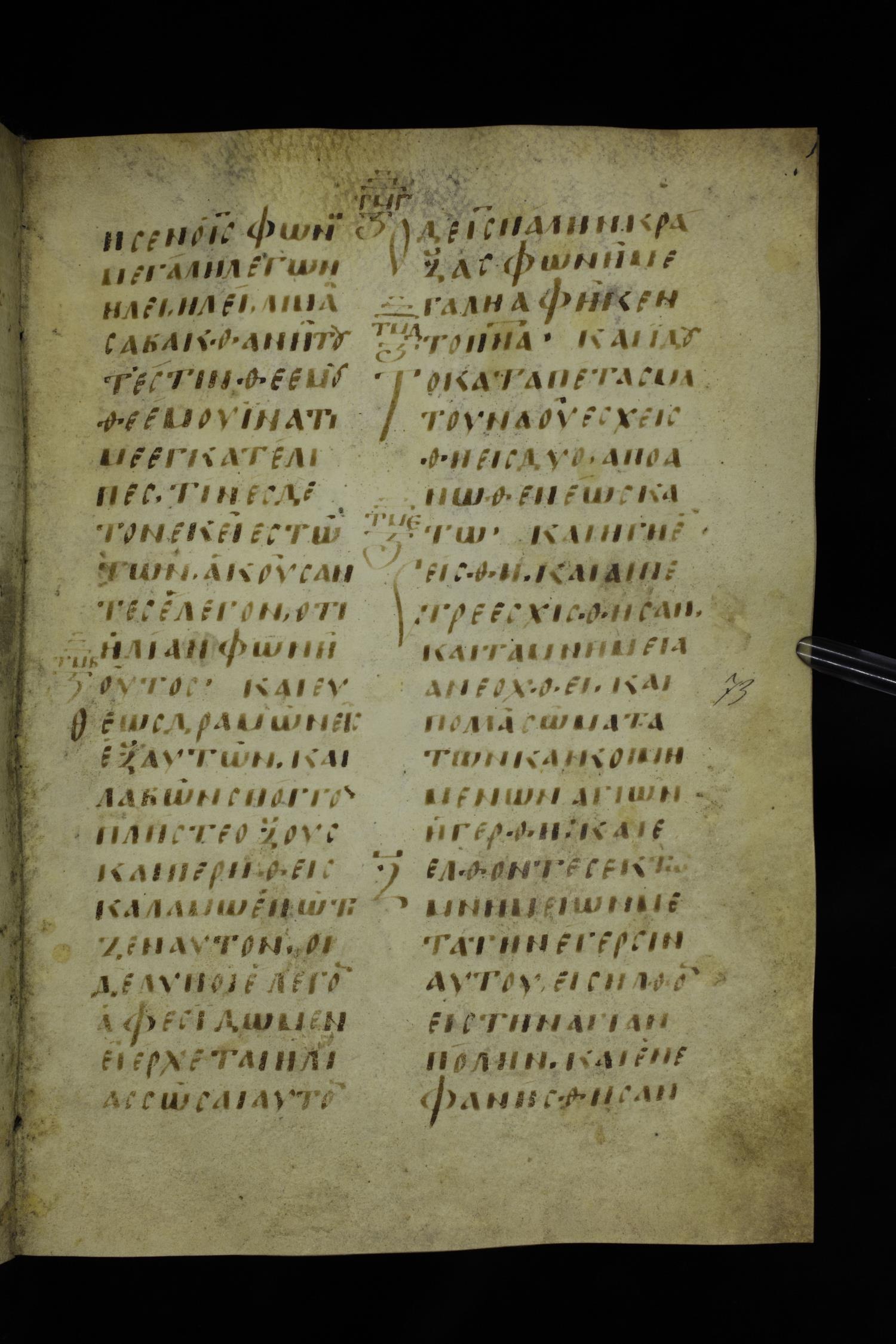 Ninth century majuscule of the Gospels on parchment; 254 leaves, 2 columns, 24-31 lines per column.