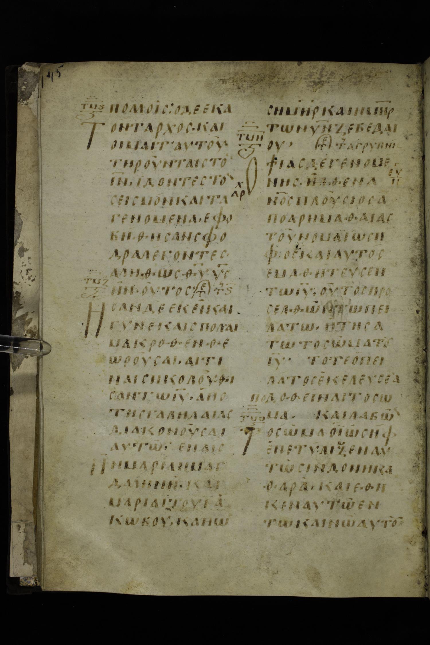 Ninth century majuscule of the Gospels on parchment; 254 leaves, 2 columns, 24-31 lines per column.