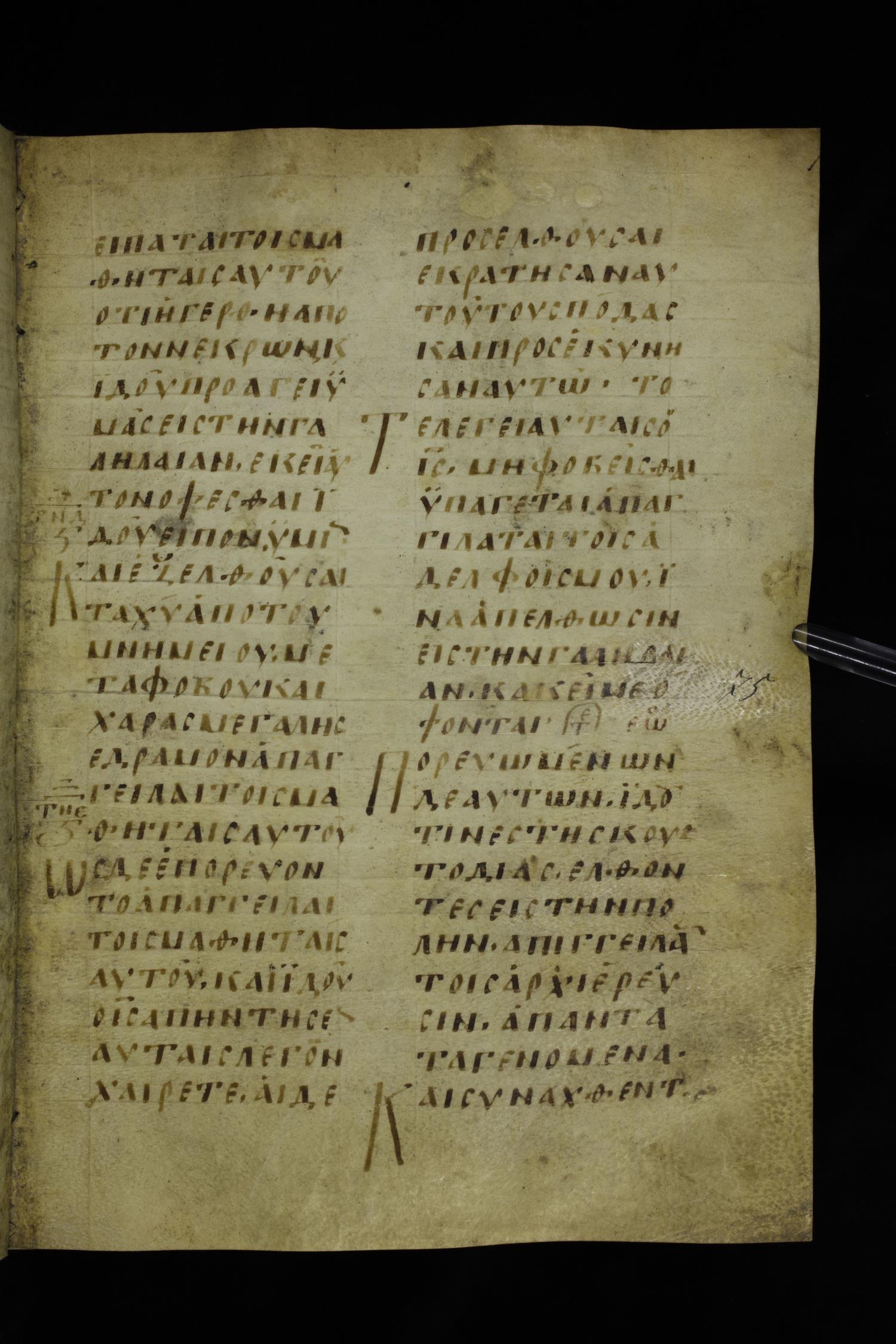 Ninth century majuscule of the Gospels on parchment; 254 leaves, 2 columns, 24-31 lines per column.