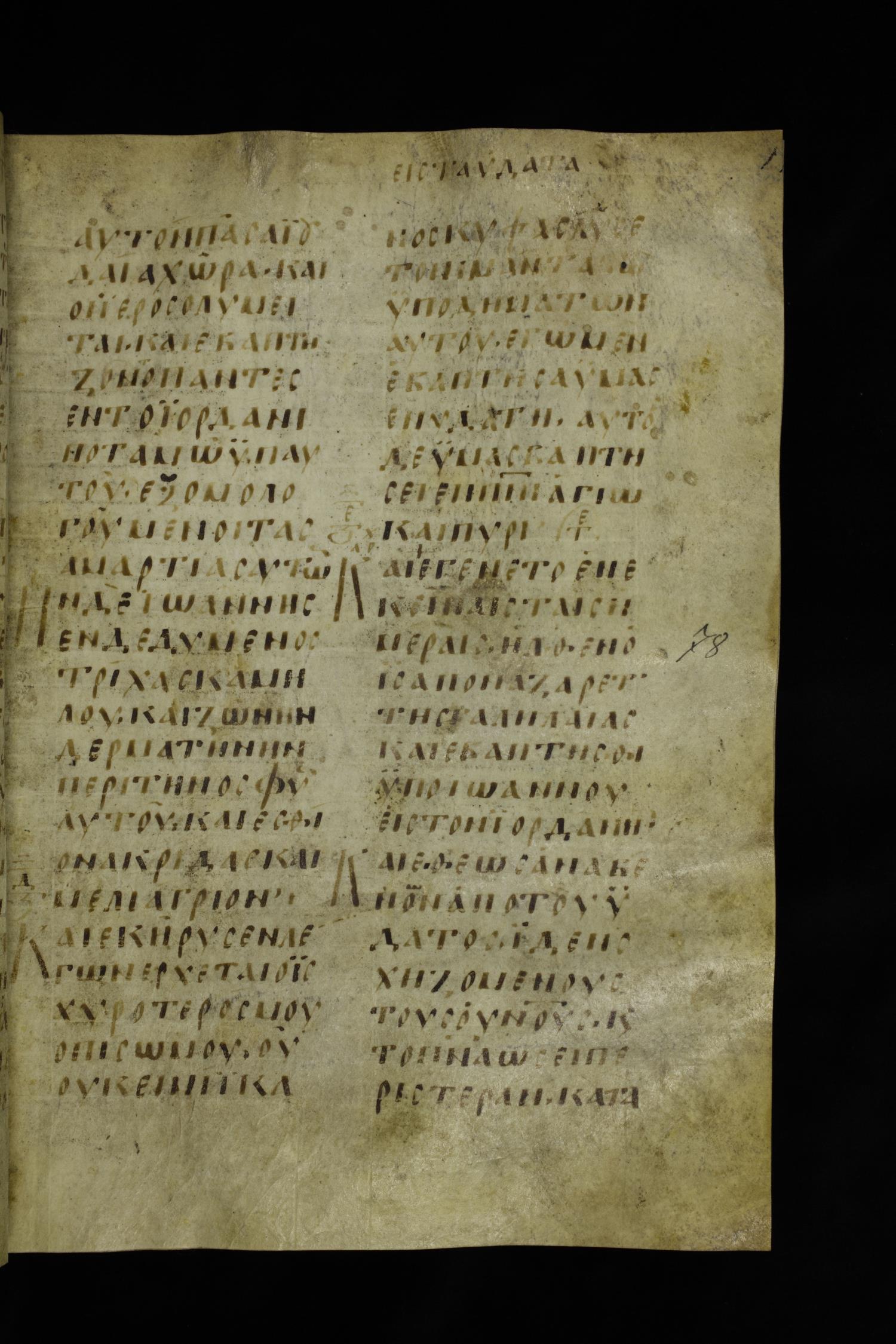 Ninth century majuscule of the Gospels on parchment; 254 leaves, 2 columns, 24-31 lines per column.