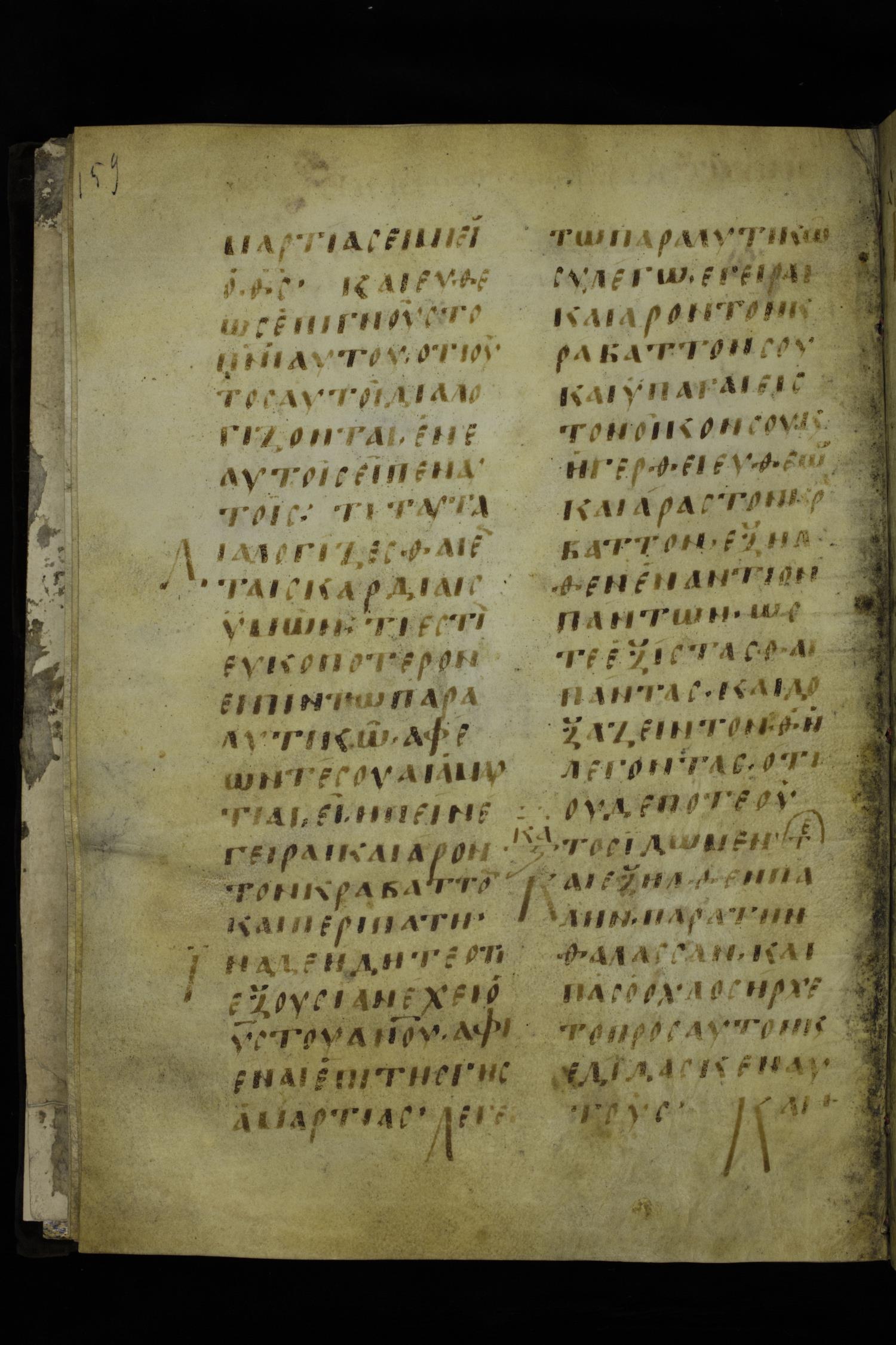 Ninth century majuscule of the Gospels on parchment; 254 leaves, 2 columns, 24-31 lines per column.