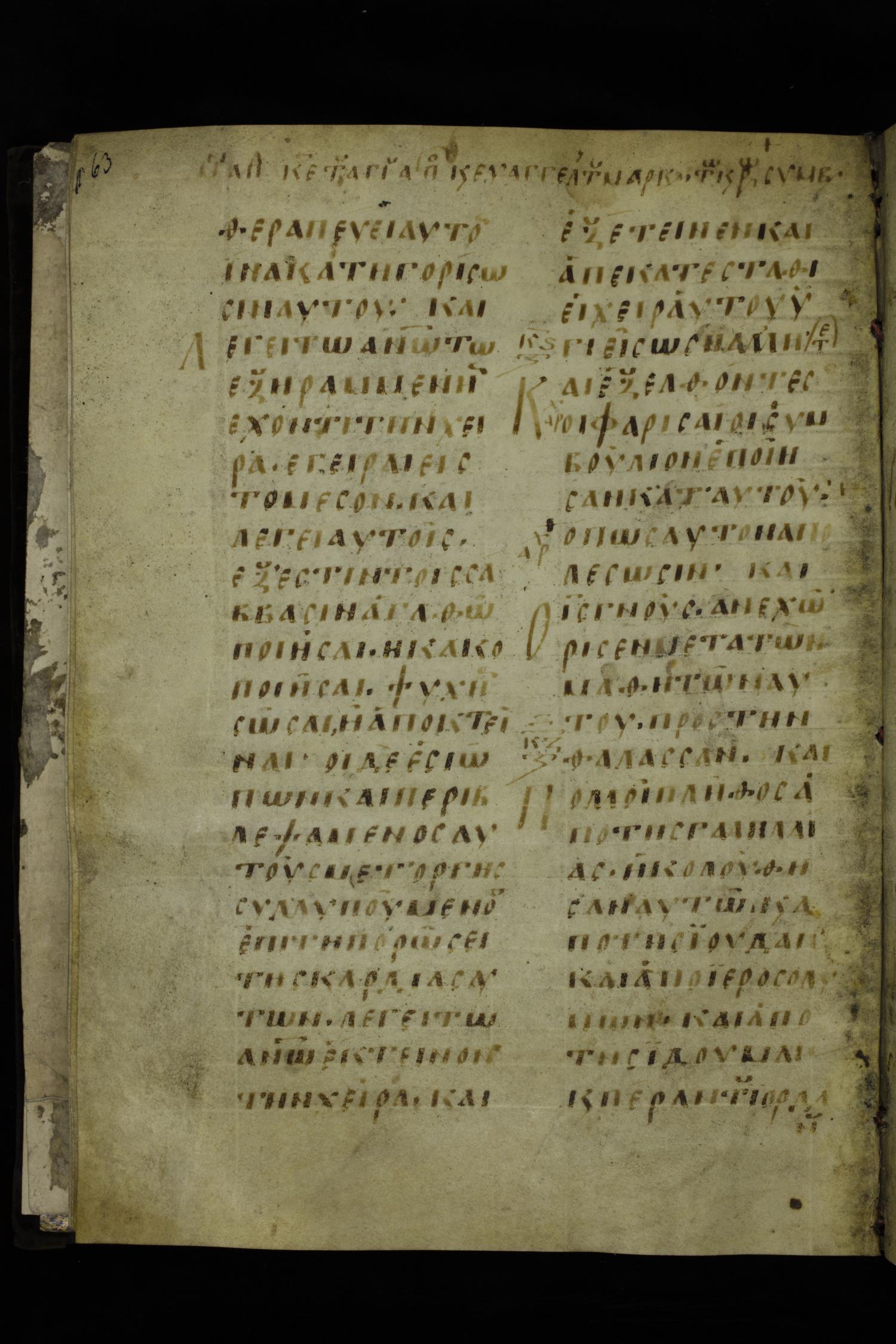 Ninth century majuscule of the Gospels on parchment; 254 leaves, 2 columns, 24-31 lines per column.