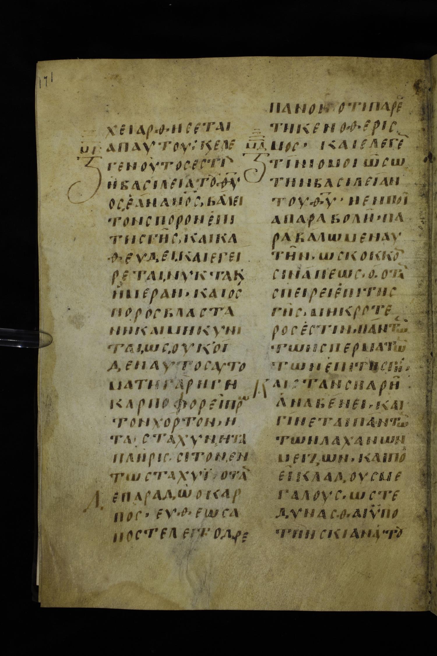 Ninth century majuscule of the Gospels on parchment; 254 leaves, 2 columns, 24-31 lines per column.