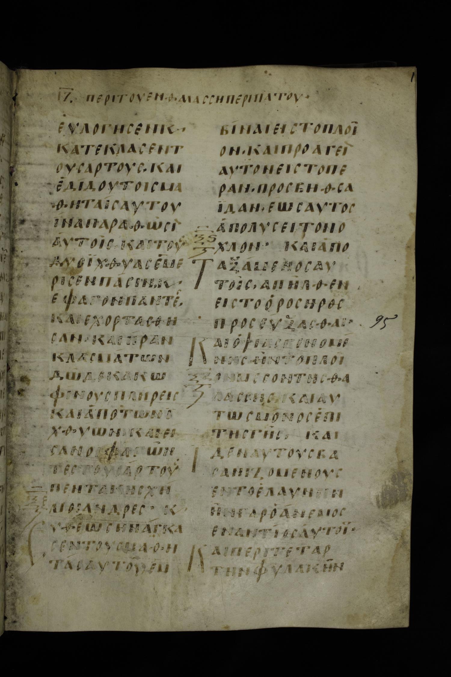 Ninth century majuscule of the Gospels on parchment; 254 leaves, 2 columns, 24-31 lines per column.