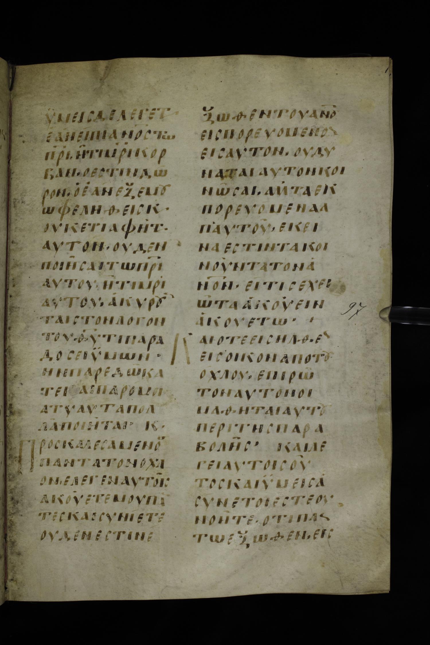 Ninth century majuscule of the Gospels on parchment; 254 leaves, 2 columns, 24-31 lines per column.