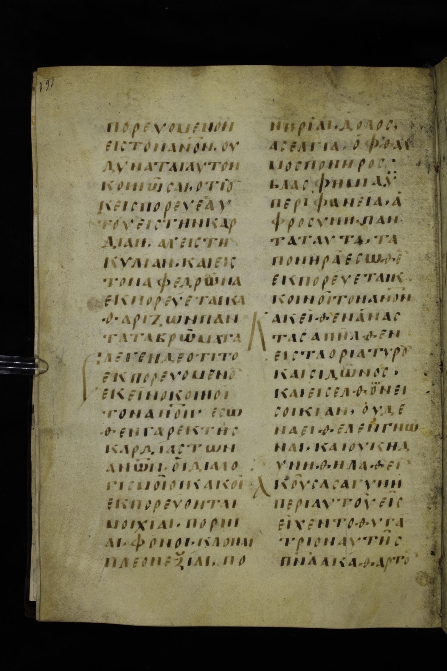 Ninth century majuscule of the Gospels on parchment; 254 leaves, 2 columns, 24-31 lines per column.