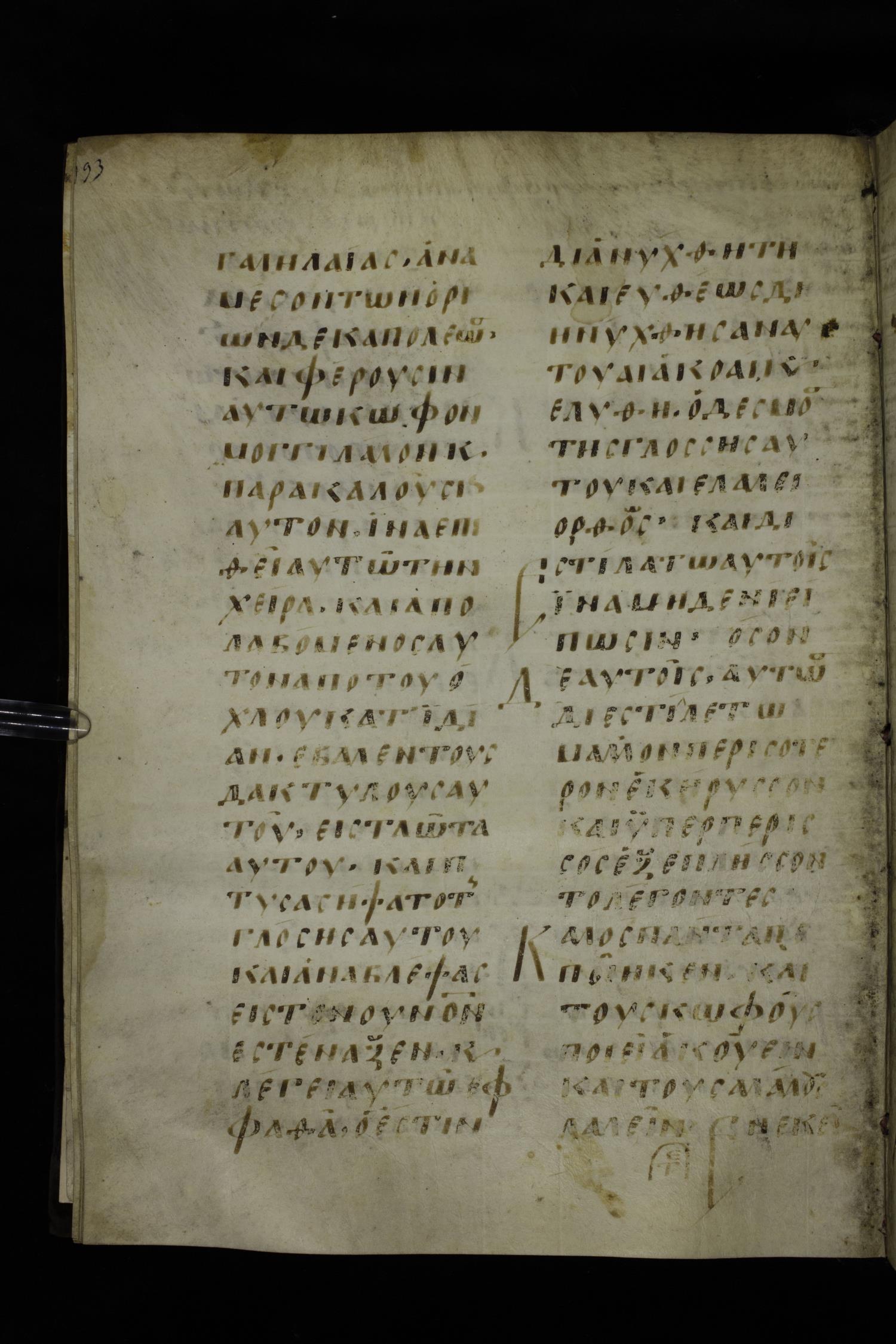 Ninth century majuscule of the Gospels on parchment; 254 leaves, 2 columns, 24-31 lines per column.