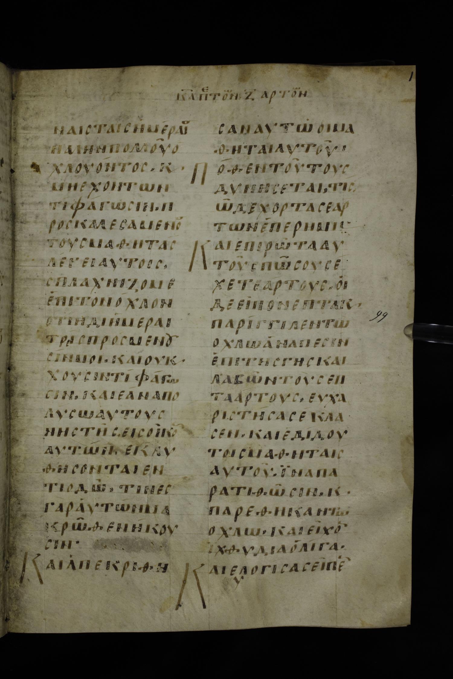 Ninth century majuscule of the Gospels on parchment; 254 leaves, 2 columns, 24-31 lines per column.