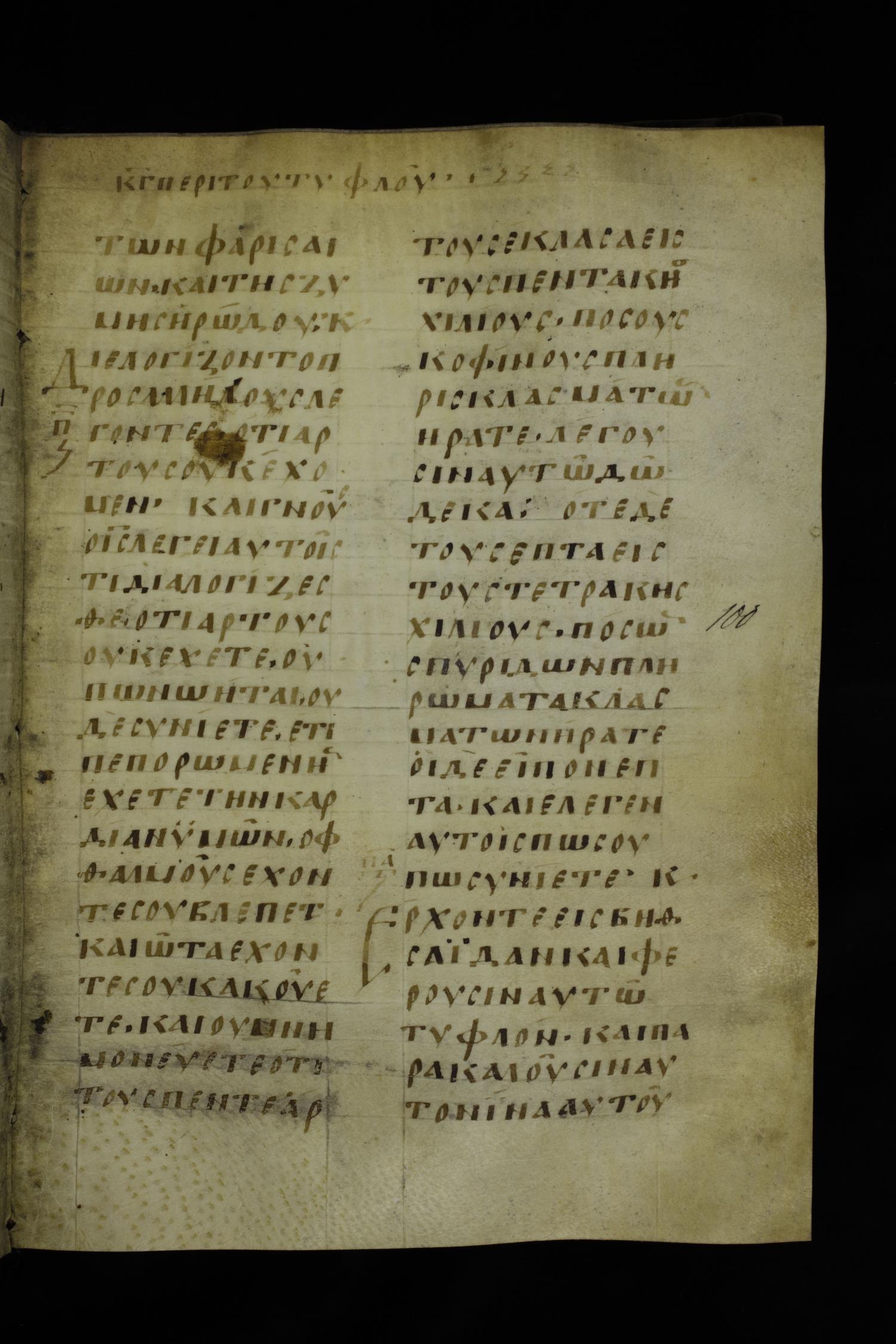 Ninth century majuscule of the Gospels on parchment; 254 leaves, 2 columns, 24-31 lines per column.