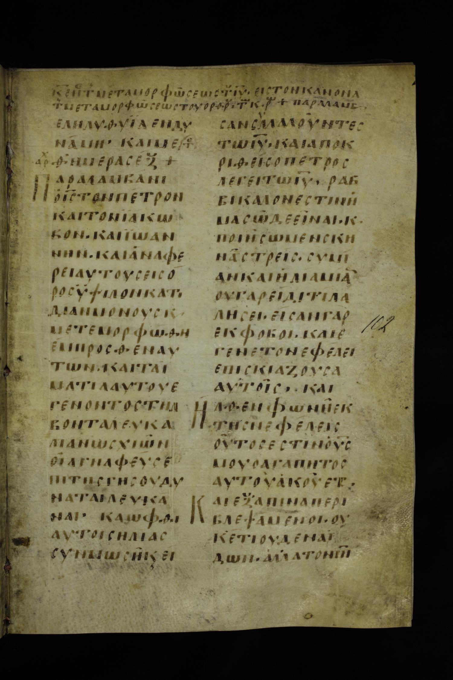 Ninth century majuscule of the Gospels on parchment; 254 leaves, 2 columns, 24-31 lines per column.