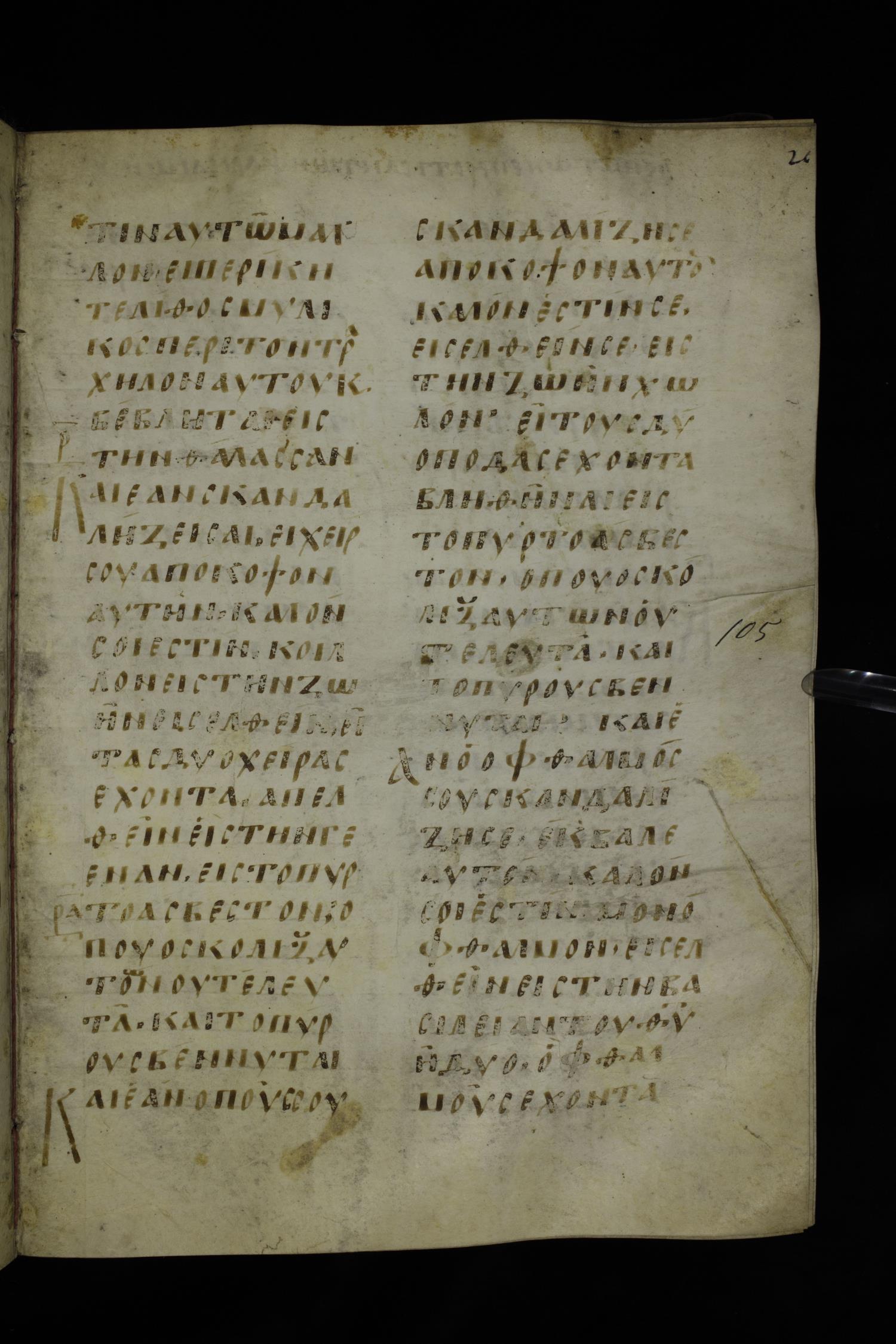 Ninth century majuscule of the Gospels on parchment; 254 leaves, 2 columns, 24-31 lines per column.
