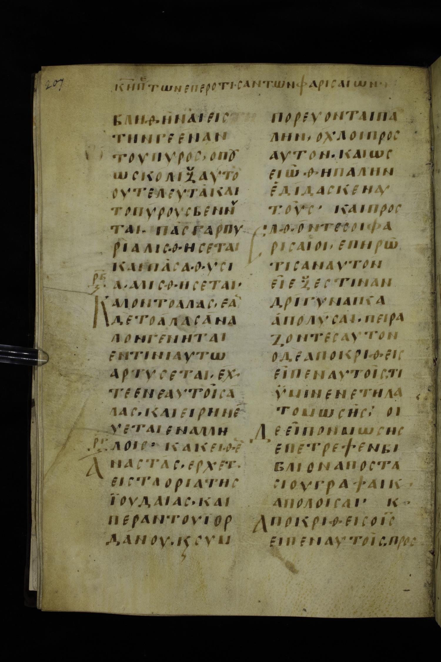 Ninth century majuscule of the Gospels on parchment; 254 leaves, 2 columns, 24-31 lines per column.
