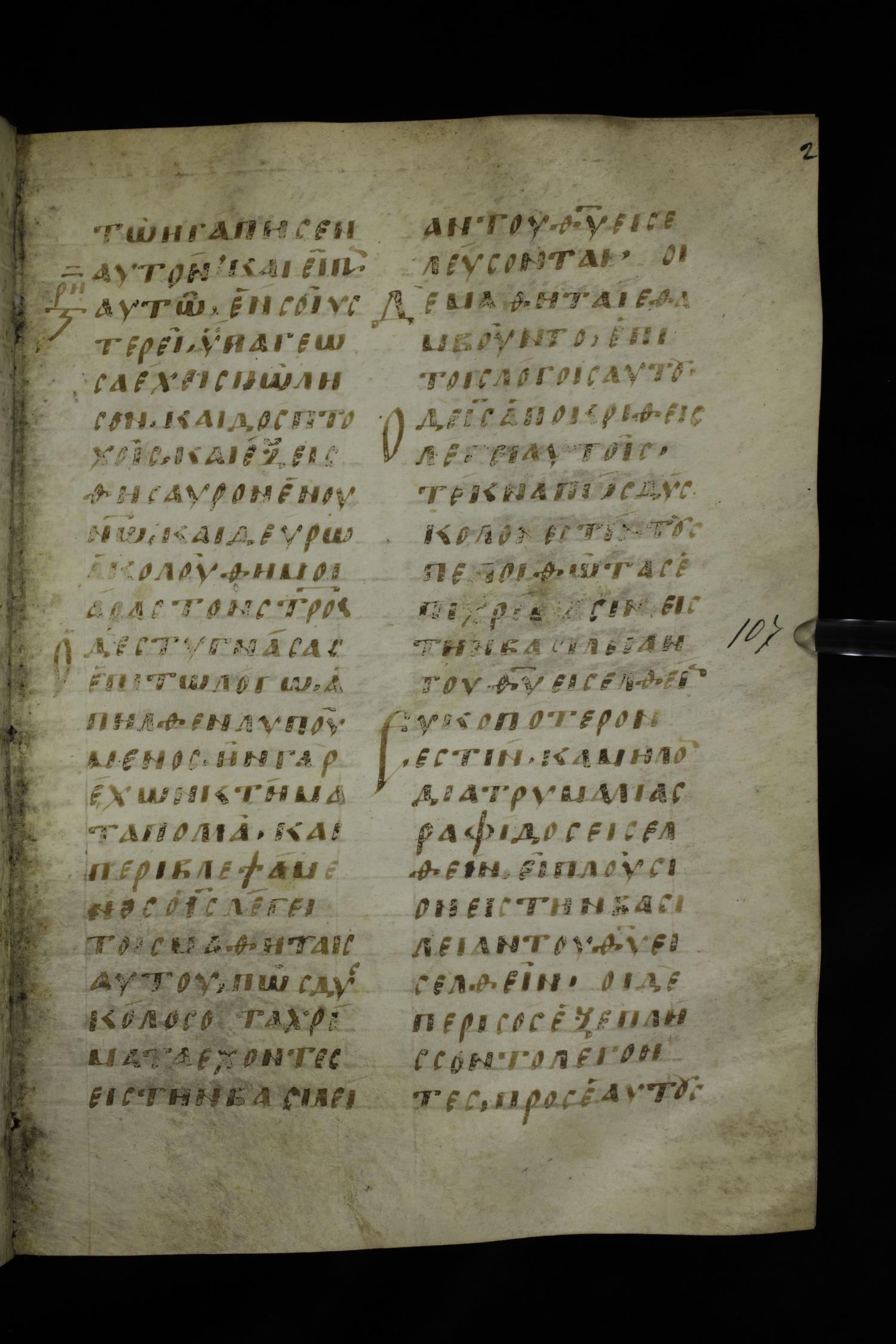 Ninth century majuscule of the Gospels on parchment; 254 leaves, 2 columns, 24-31 lines per column.
