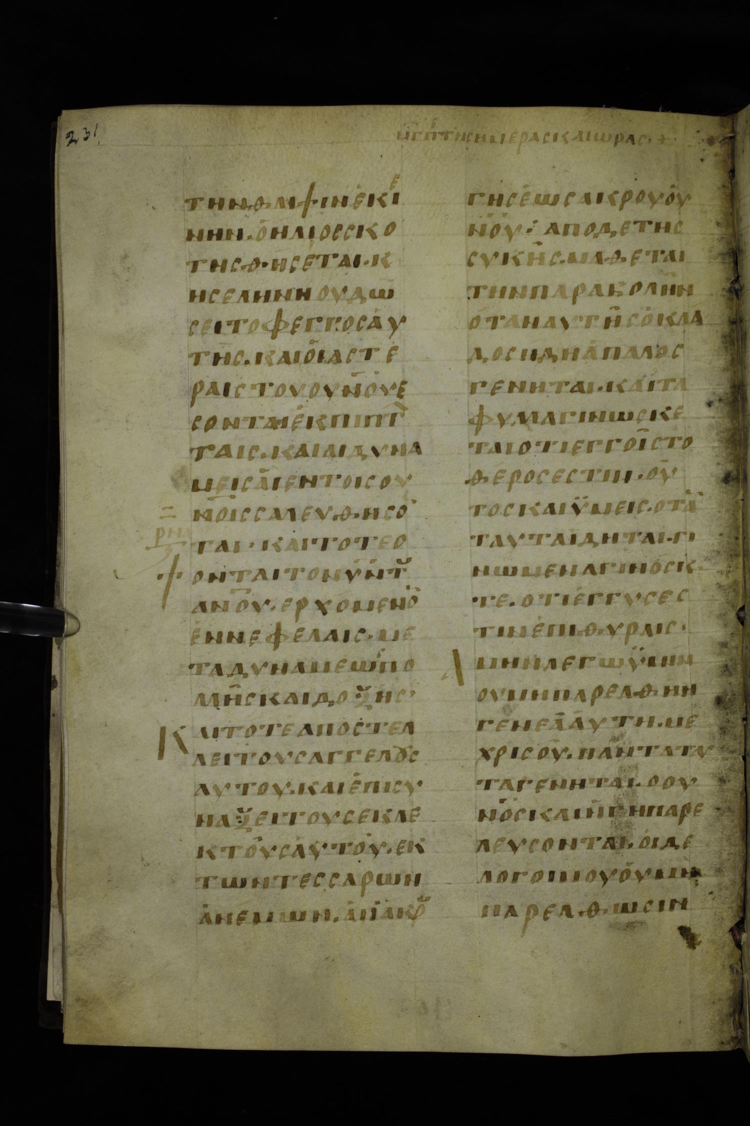 Ninth century majuscule of the Gospels on parchment; 254 leaves, 2 columns, 24-31 lines per column.