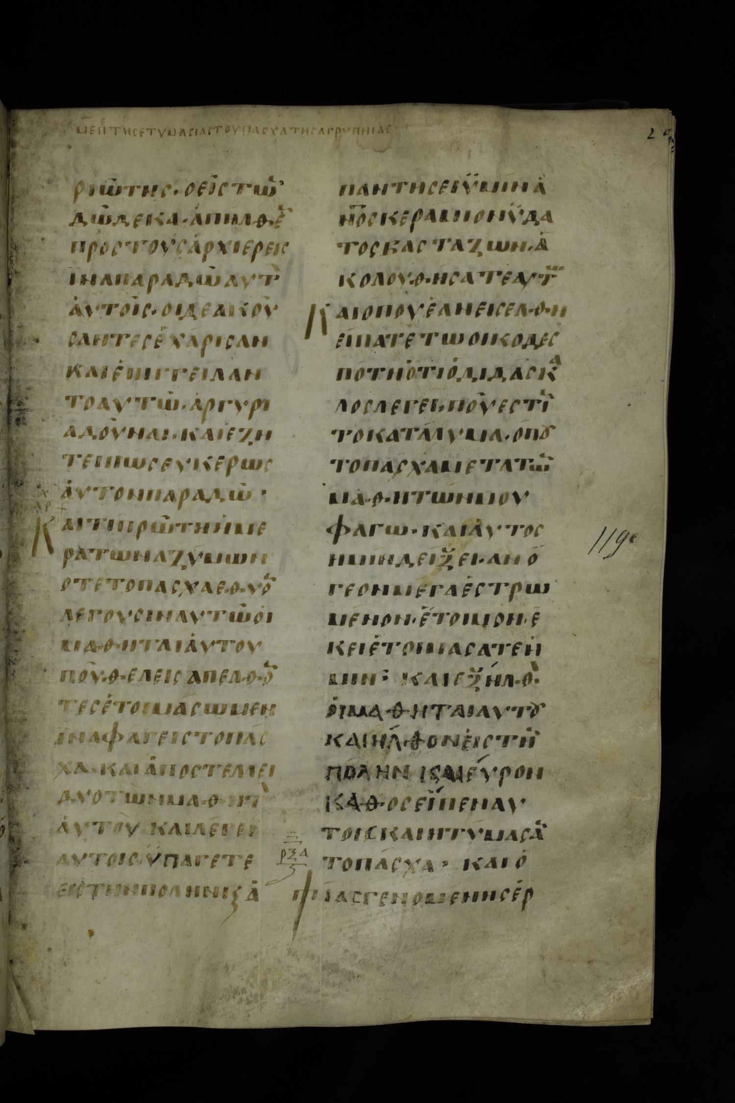 Ninth century majuscule of the Gospels on parchment; 254 leaves, 2 columns, 24-31 lines per column.