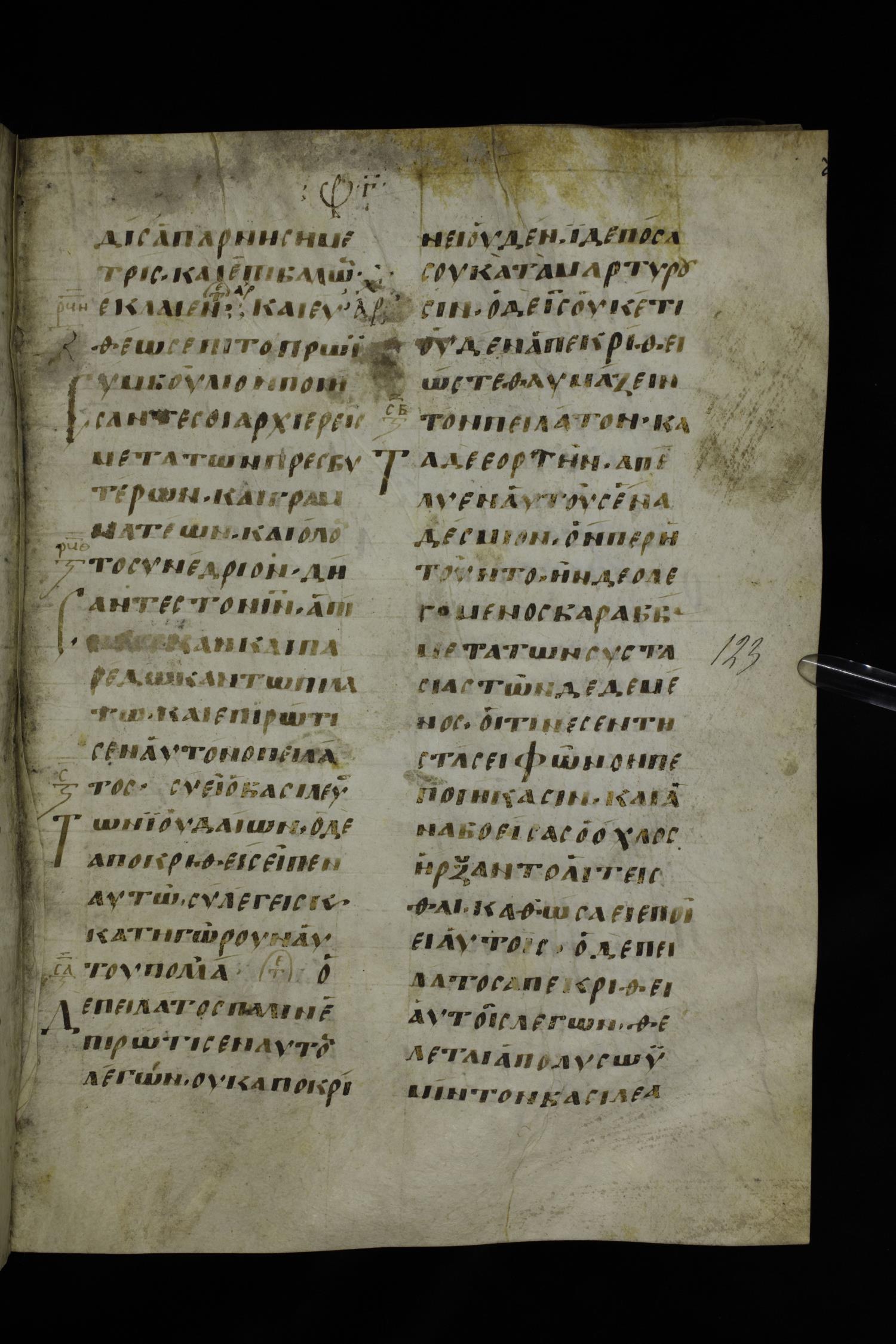 Ninth century majuscule of the Gospels on parchment; 254 leaves, 2 columns, 24-31 lines per column.