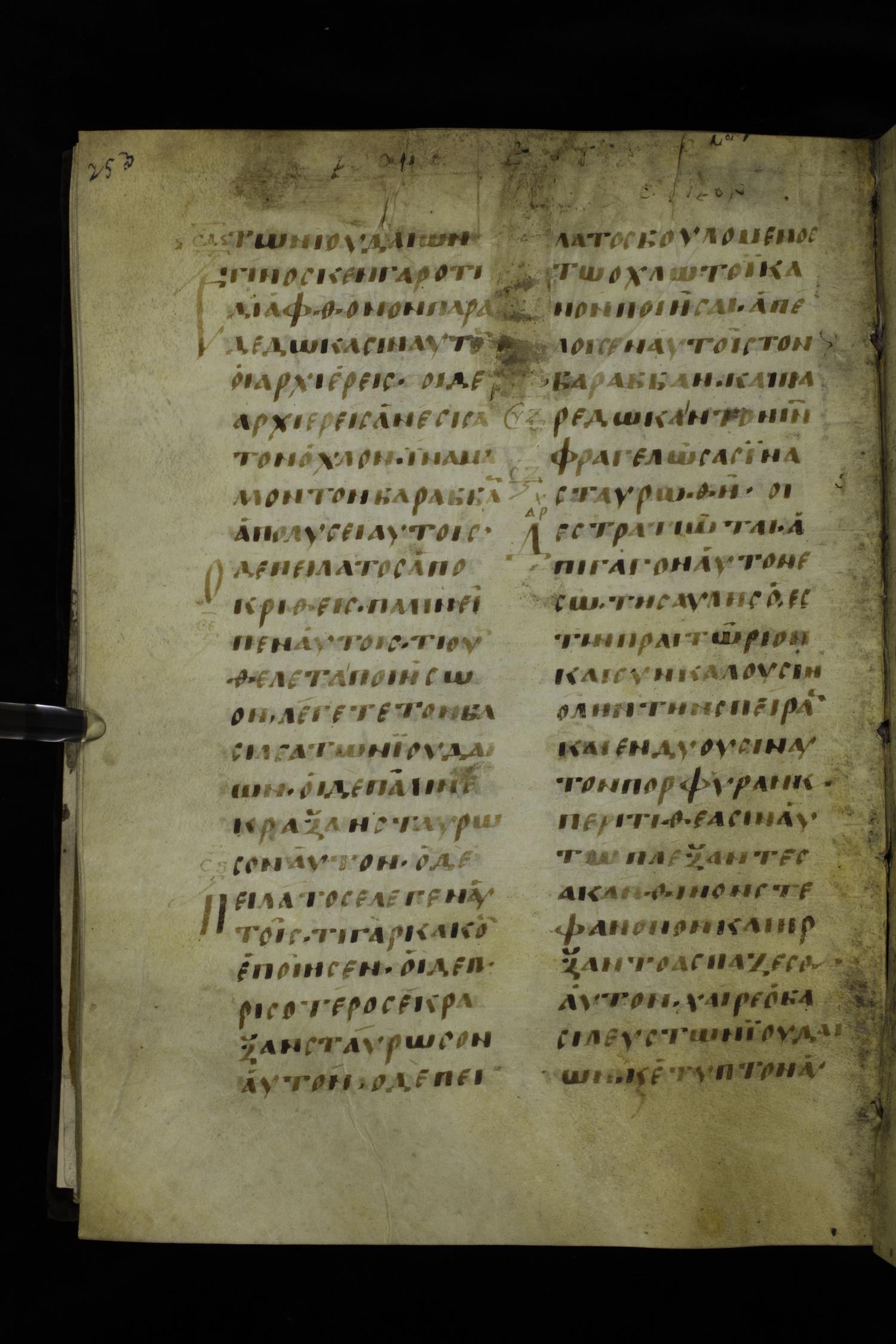 Ninth century majuscule of the Gospels on parchment; 254 leaves, 2 columns, 24-31 lines per column.