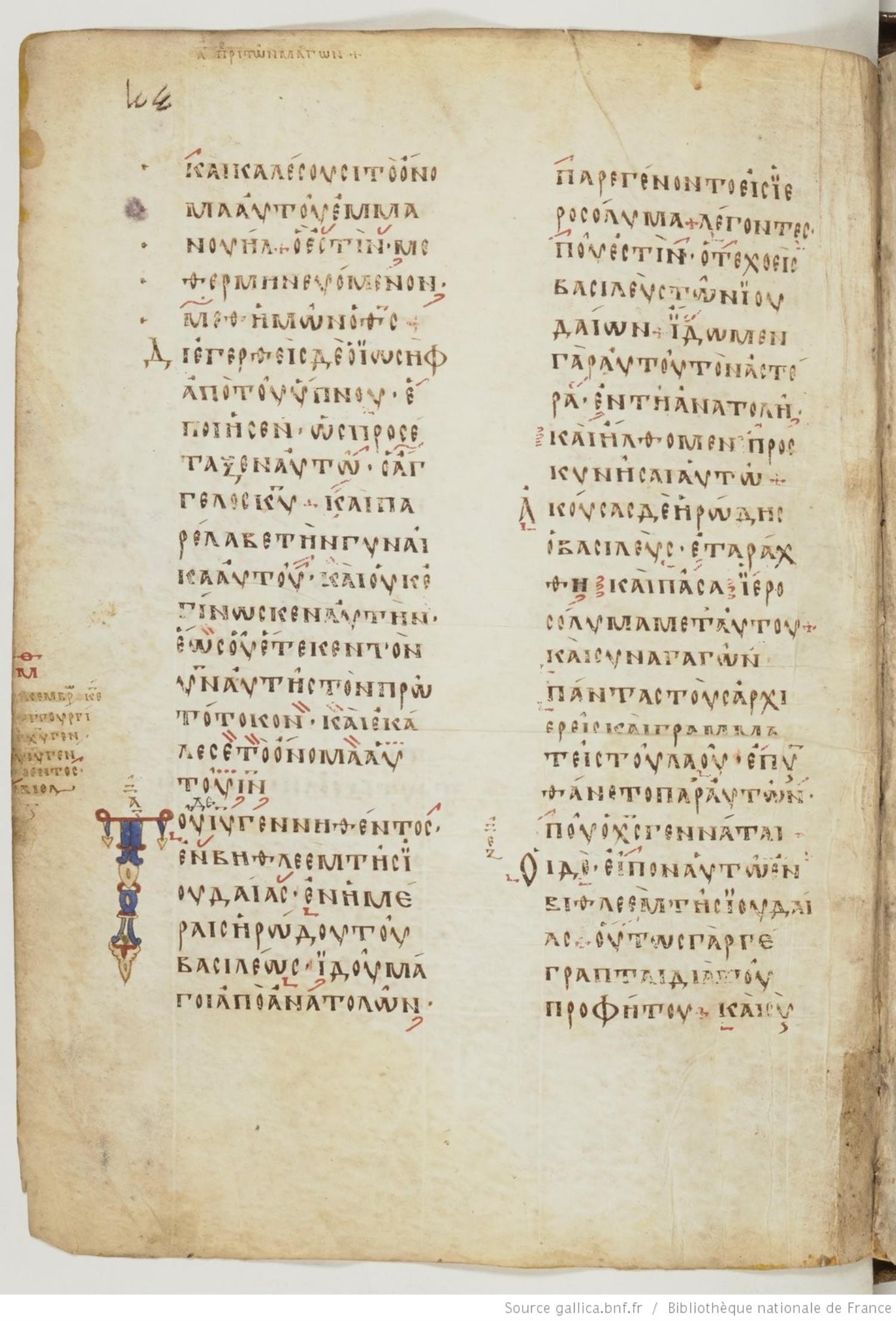 Ninth century majuscule of the Gospels on parchment; 257 leaves, 2 columns, 24 lines per column. For recent images, please visit the Bibliothèque Nationale.