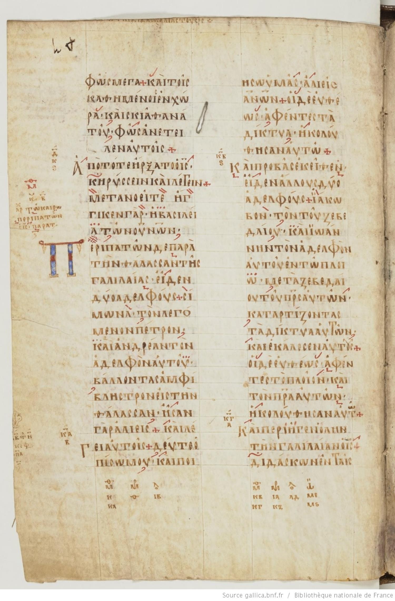 Ninth century majuscule of the Gospels on parchment; 257 leaves, 2 columns, 24 lines per column. For recent images, please visit the Bibliothèque Nationale.