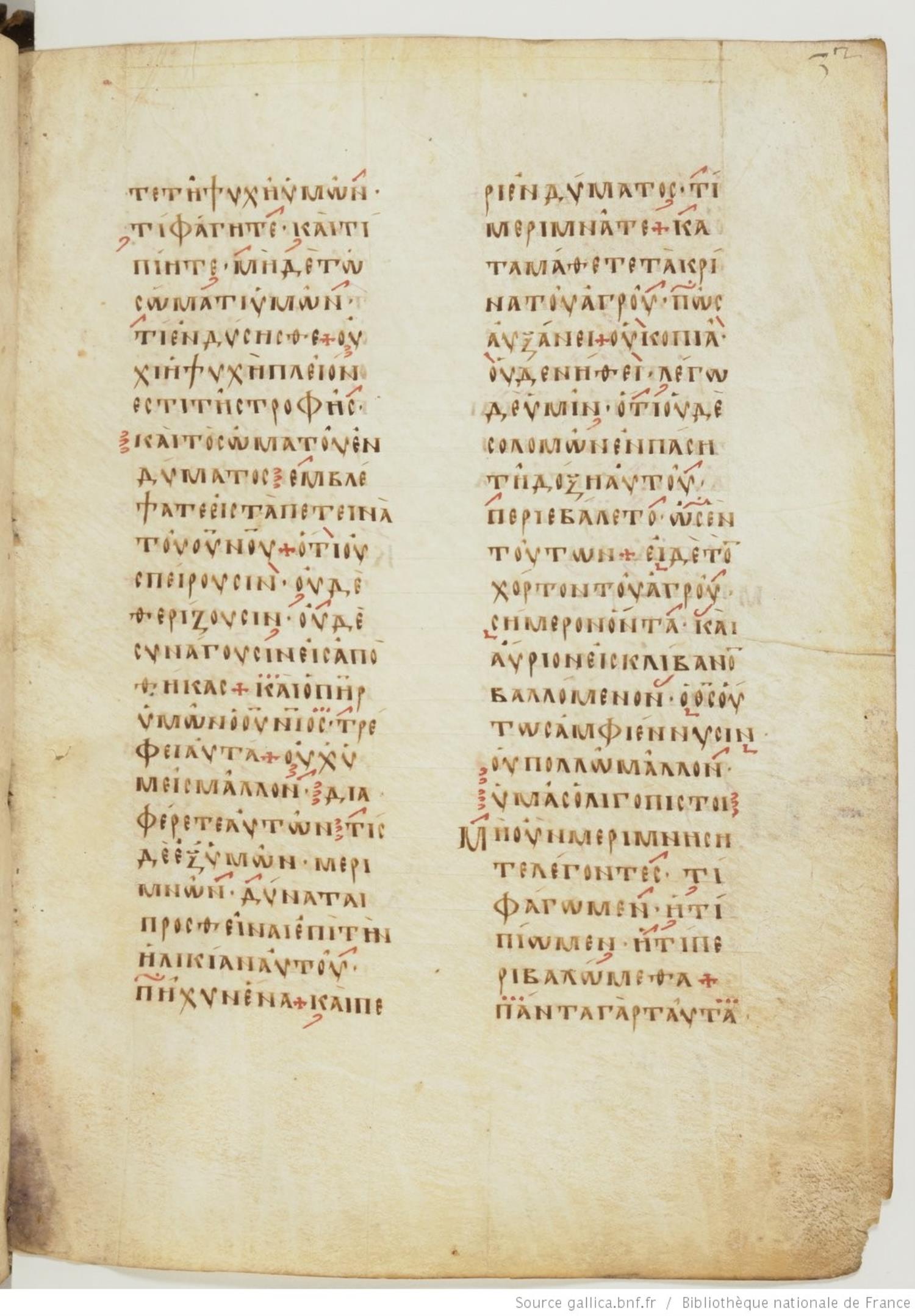 Ninth century majuscule of the Gospels on parchment; 257 leaves, 2 columns, 24 lines per column. For recent images, please visit the Bibliothèque Nationale.