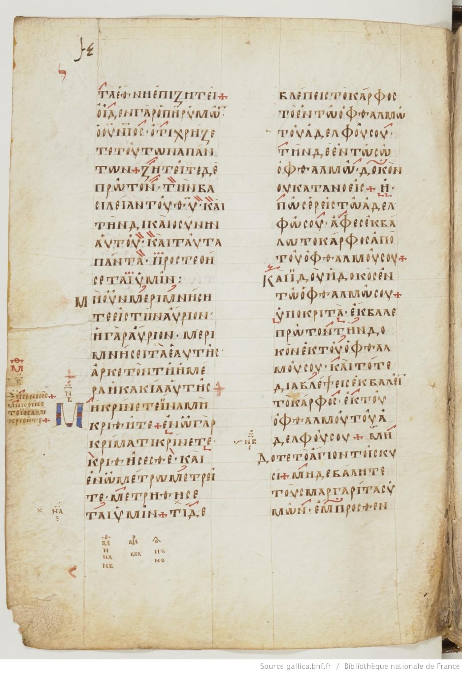 Ninth century majuscule of the Gospels on parchment; 257 leaves, 2 columns, 24 lines per column. For recent images, please visit the Bibliothèque Nationale.