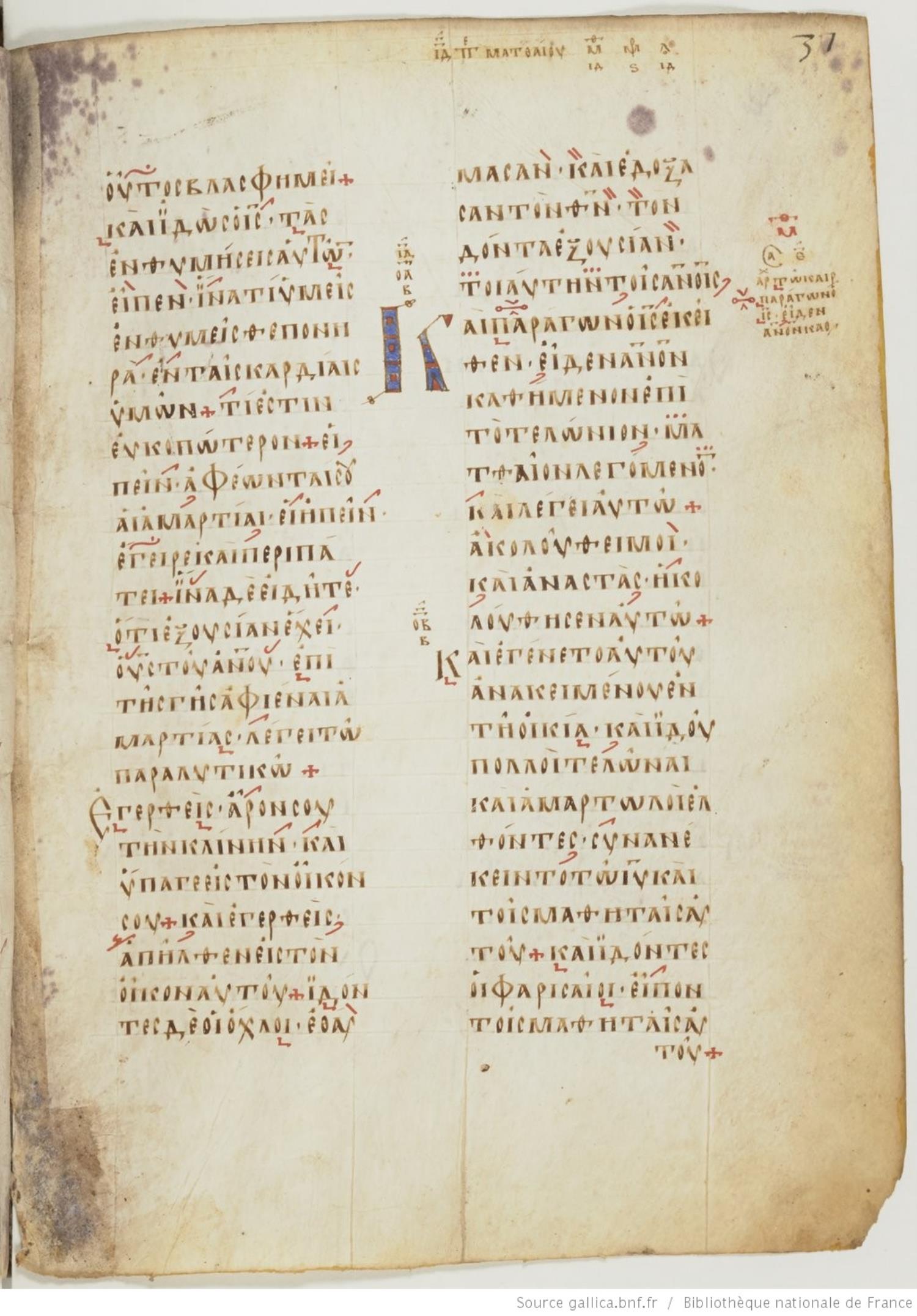 Ninth century majuscule of the Gospels on parchment; 257 leaves, 2 columns, 24 lines per column. For recent images, please visit the Bibliothèque Nationale.