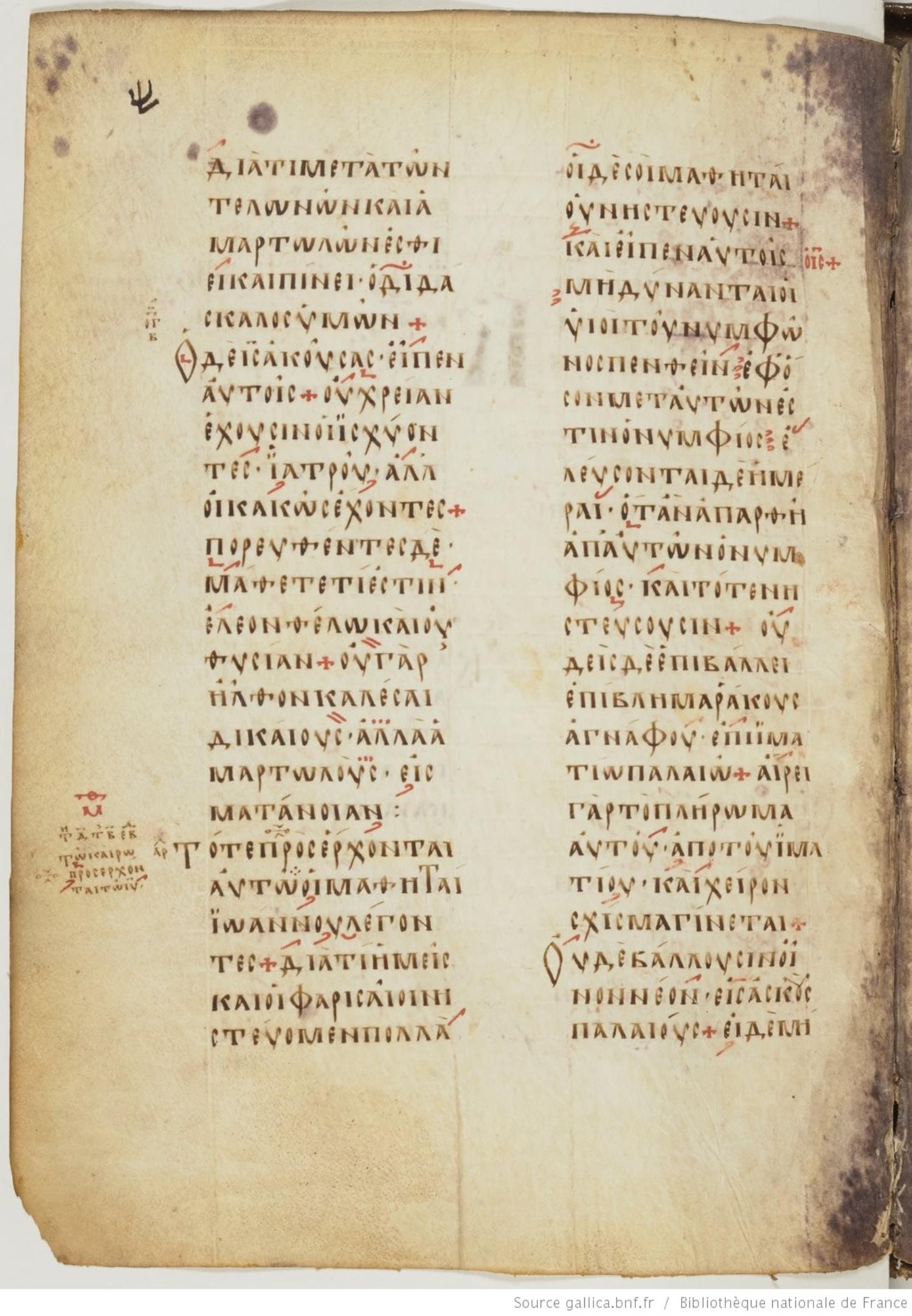 Ninth century majuscule of the Gospels on parchment; 257 leaves, 2 columns, 24 lines per column. For recent images, please visit the Bibliothèque Nationale.