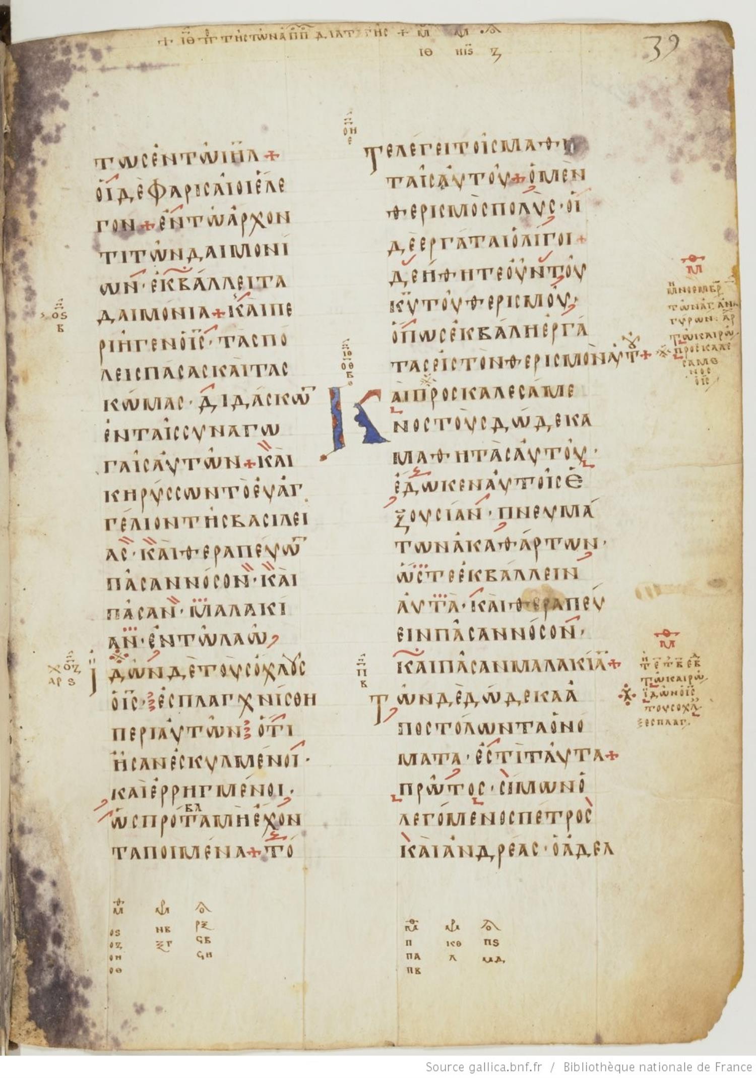 Ninth century majuscule of the Gospels on parchment; 257 leaves, 2 columns, 24 lines per column. For recent images, please visit the Bibliothèque Nationale.