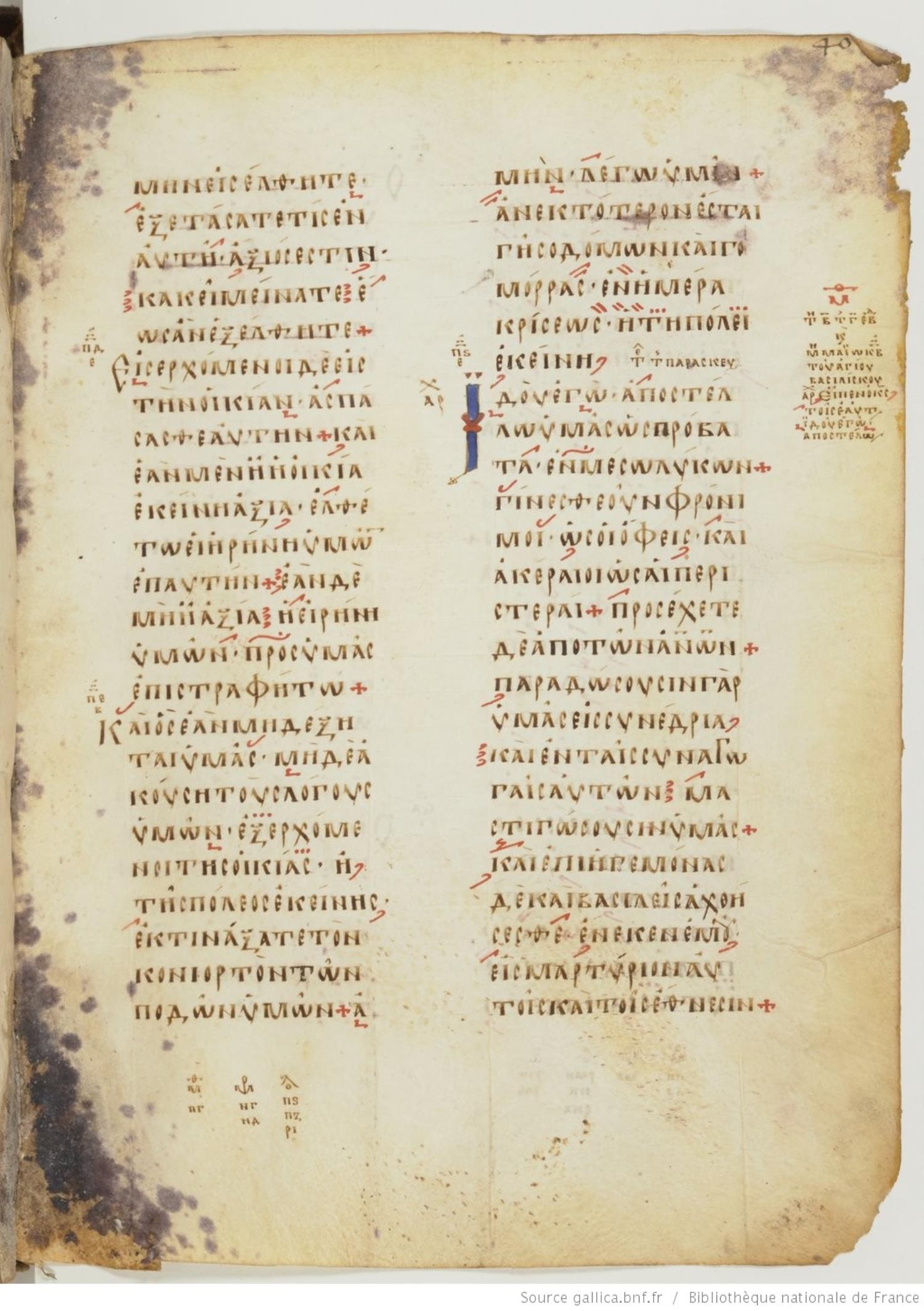 Ninth century majuscule of the Gospels on parchment; 257 leaves, 2 columns, 24 lines per column. For recent images, please visit the Bibliothèque Nationale.