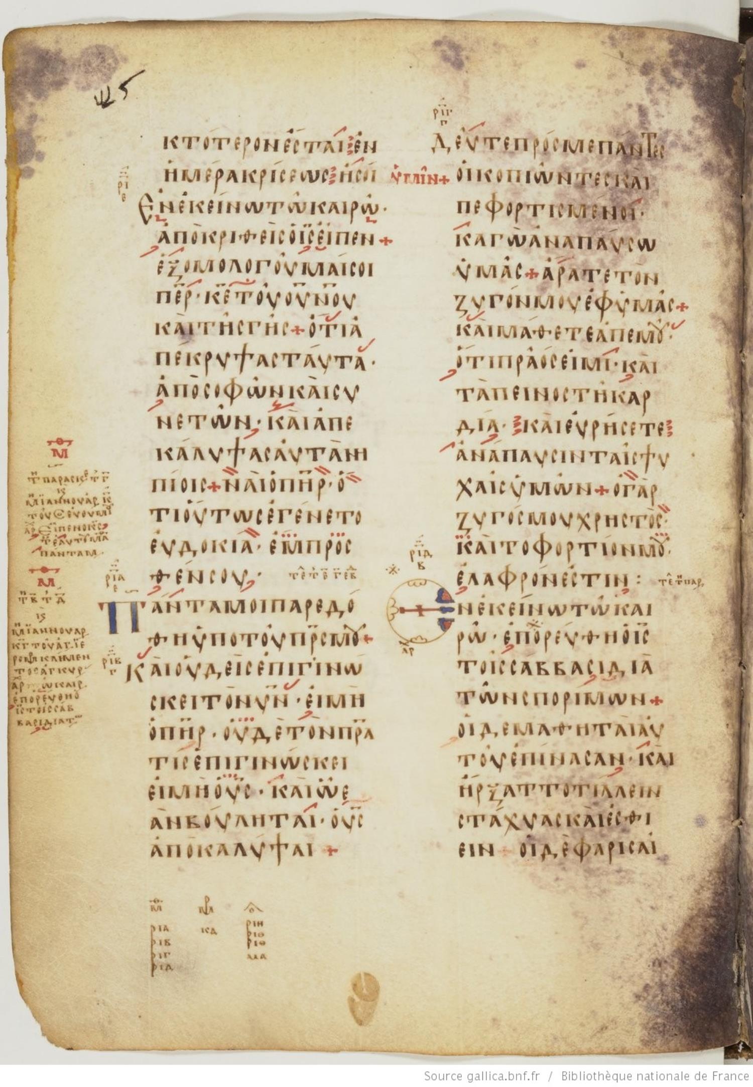 Ninth century majuscule of the Gospels on parchment; 257 leaves, 2 columns, 24 lines per column. For recent images, please visit the Bibliothèque Nationale.
