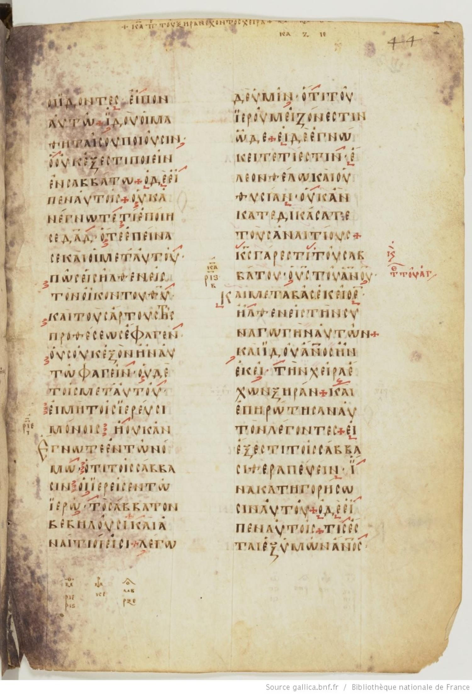 Ninth century majuscule of the Gospels on parchment; 257 leaves, 2 columns, 24 lines per column. For recent images, please visit the Bibliothèque Nationale.