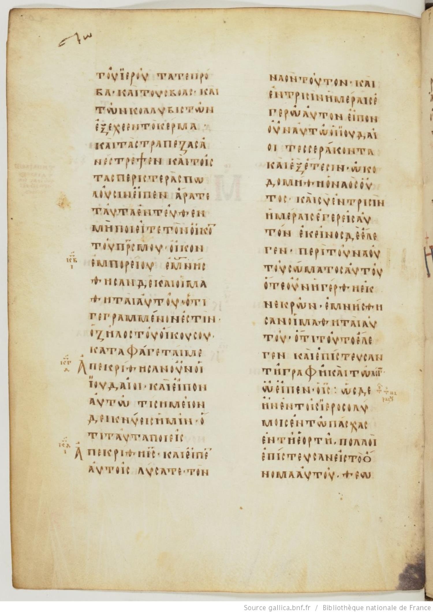 Ninth century majuscule of the Gospels on parchment; 257 leaves, 2 columns, 24 lines per column. For recent images, please visit the Bibliothèque Nationale.