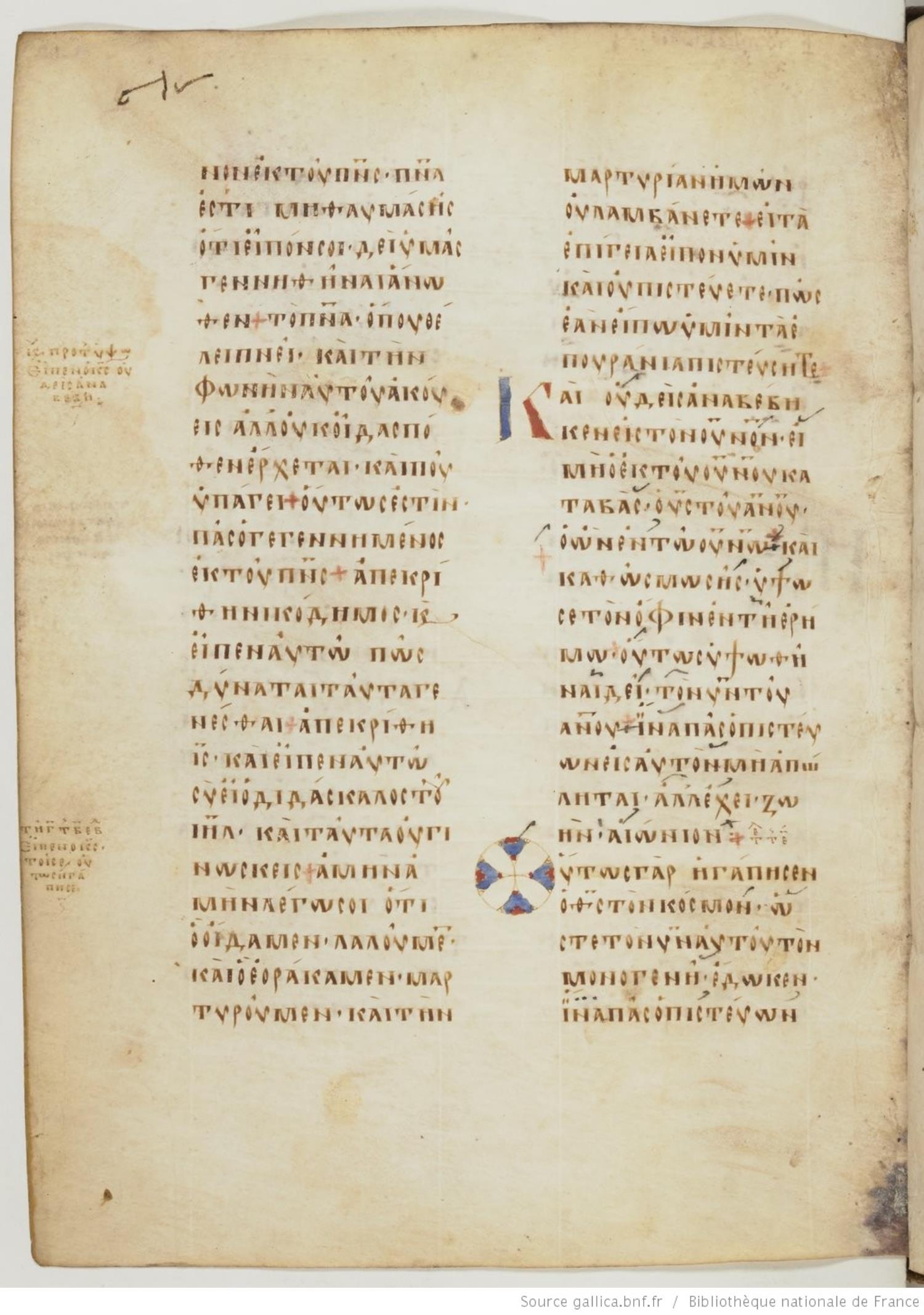 Ninth century majuscule of the Gospels on parchment; 257 leaves, 2 columns, 24 lines per column. For recent images, please visit the Bibliothèque Nationale.