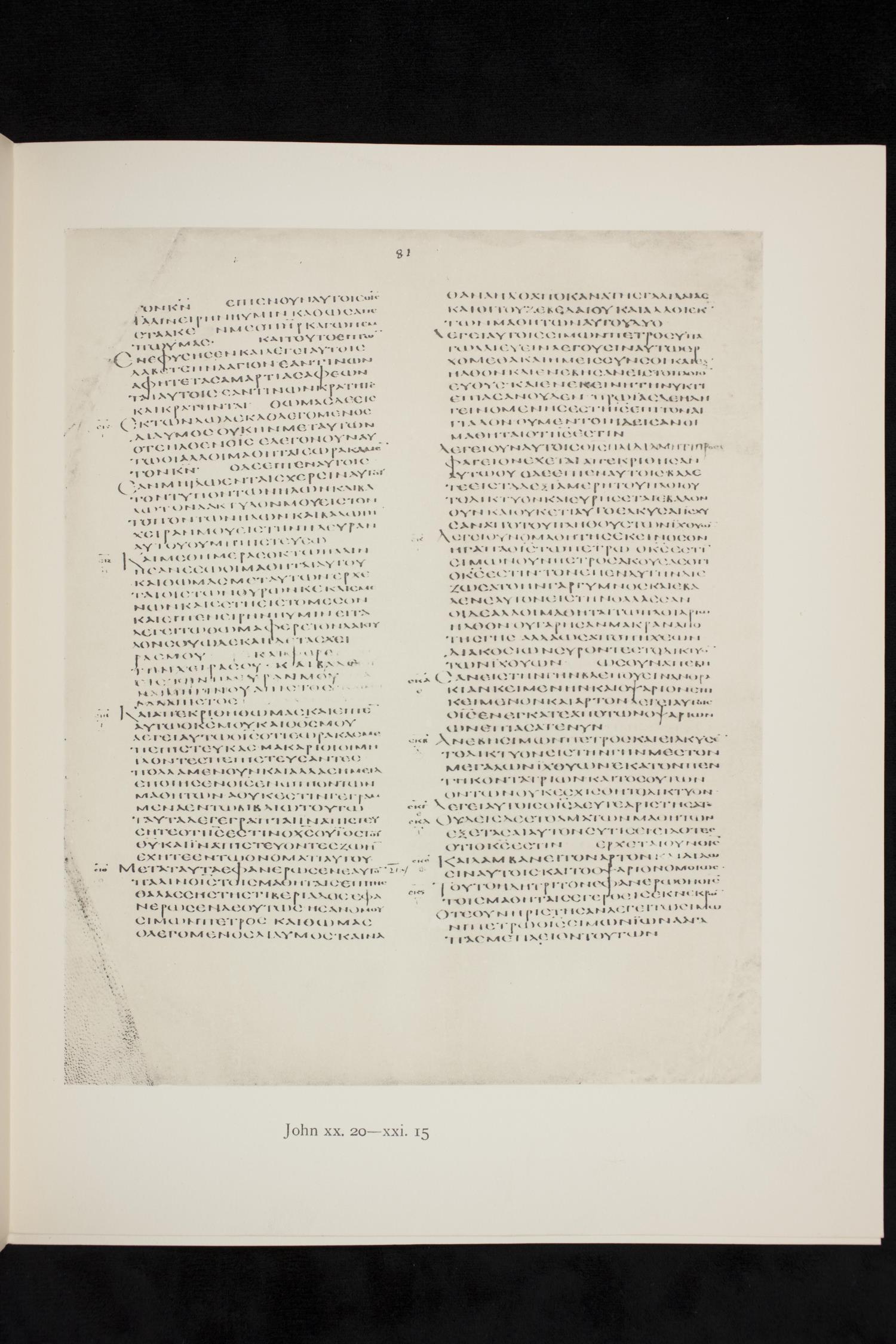 Codex Alexandrinus is a fifth century manuscript of the Greek Old Testament, the New Testament, and the Clementine Epistles on parchment. Images are from the 1879–1883 and 1909 full-sized black and white facsimiles produced by the British Museum. For more recent images, please visit the British Museum
