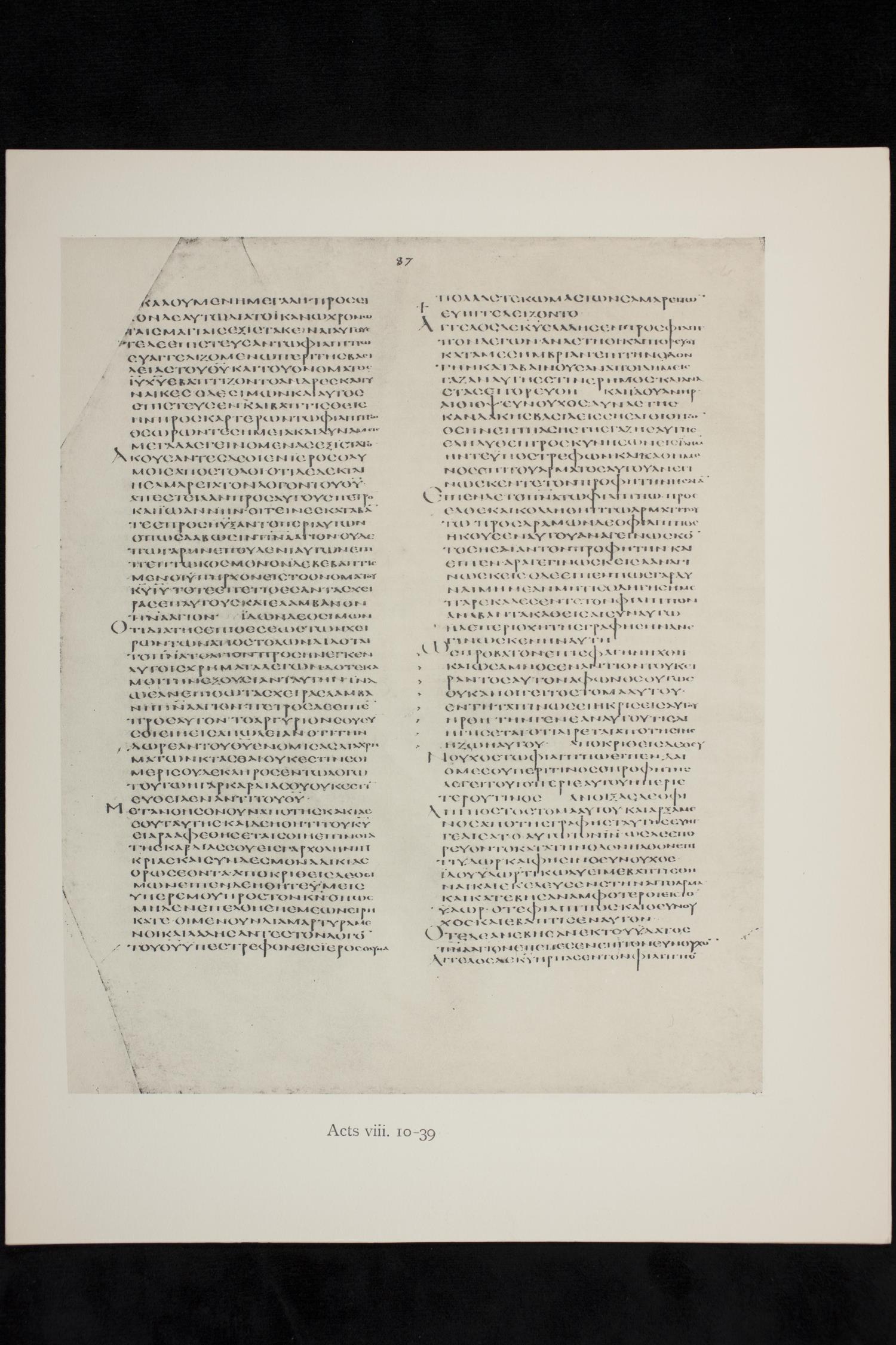 Codex Alexandrinus is a fifth century manuscript of the Greek Old Testament, the New Testament, and the Clementine Epistles on parchment. Images are from the 1879–1883 and 1909 full-sized black and white facsimiles produced by the British Museum. For more recent images, please visit the British Museum