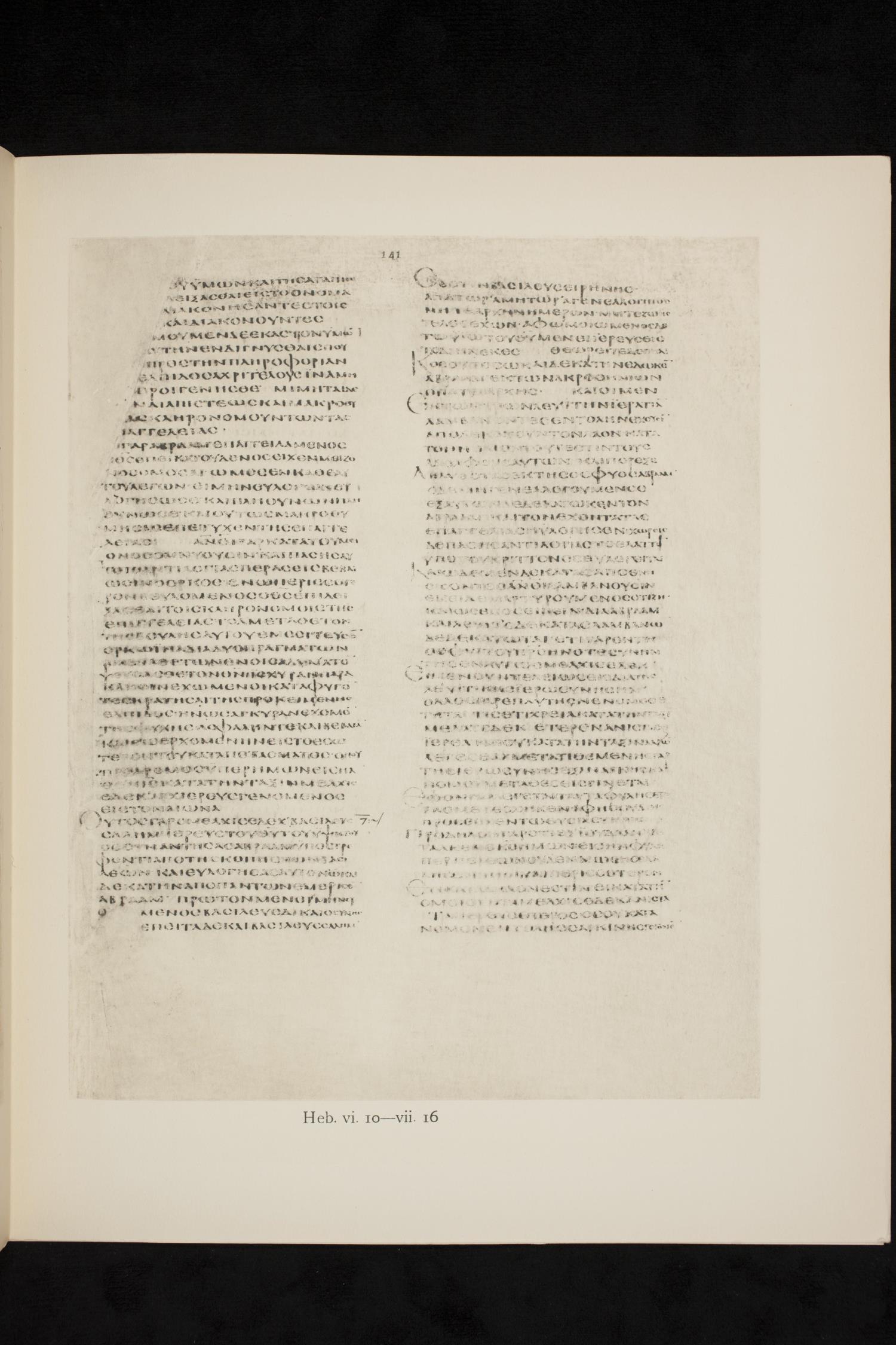 ἀπάτωρ, ἀμήτωρ, ἀγενεαλόγητος, μήτε ἀρχὴν ἡμερῶν μήτε ζωῆς τέλος ἔχων, ἀφωμοιωμένος δὲ τῷ υἱῷ τοῦ θεοῦ, μένει ἱερεὺς εἰς τὸ διηνεκές.